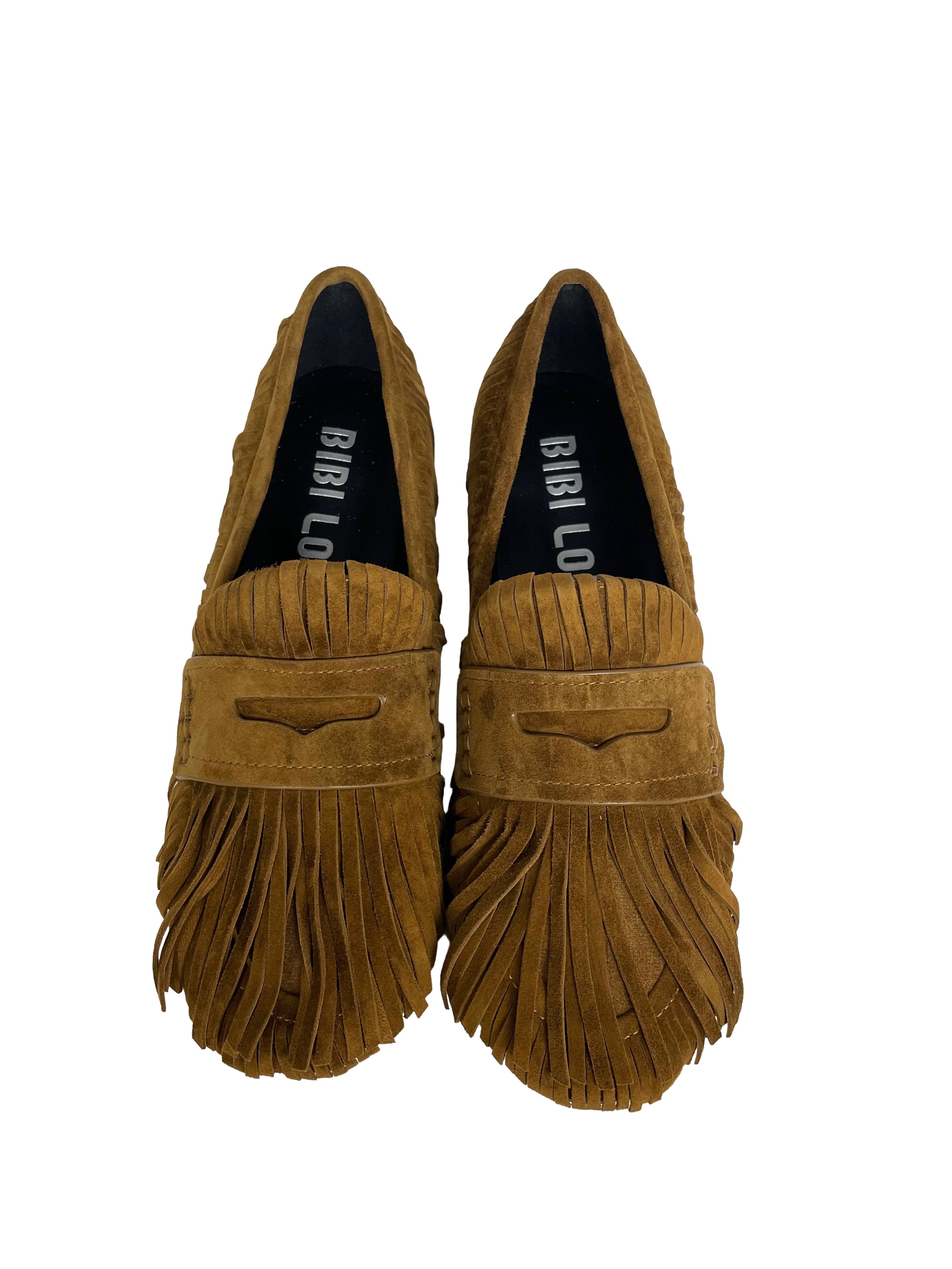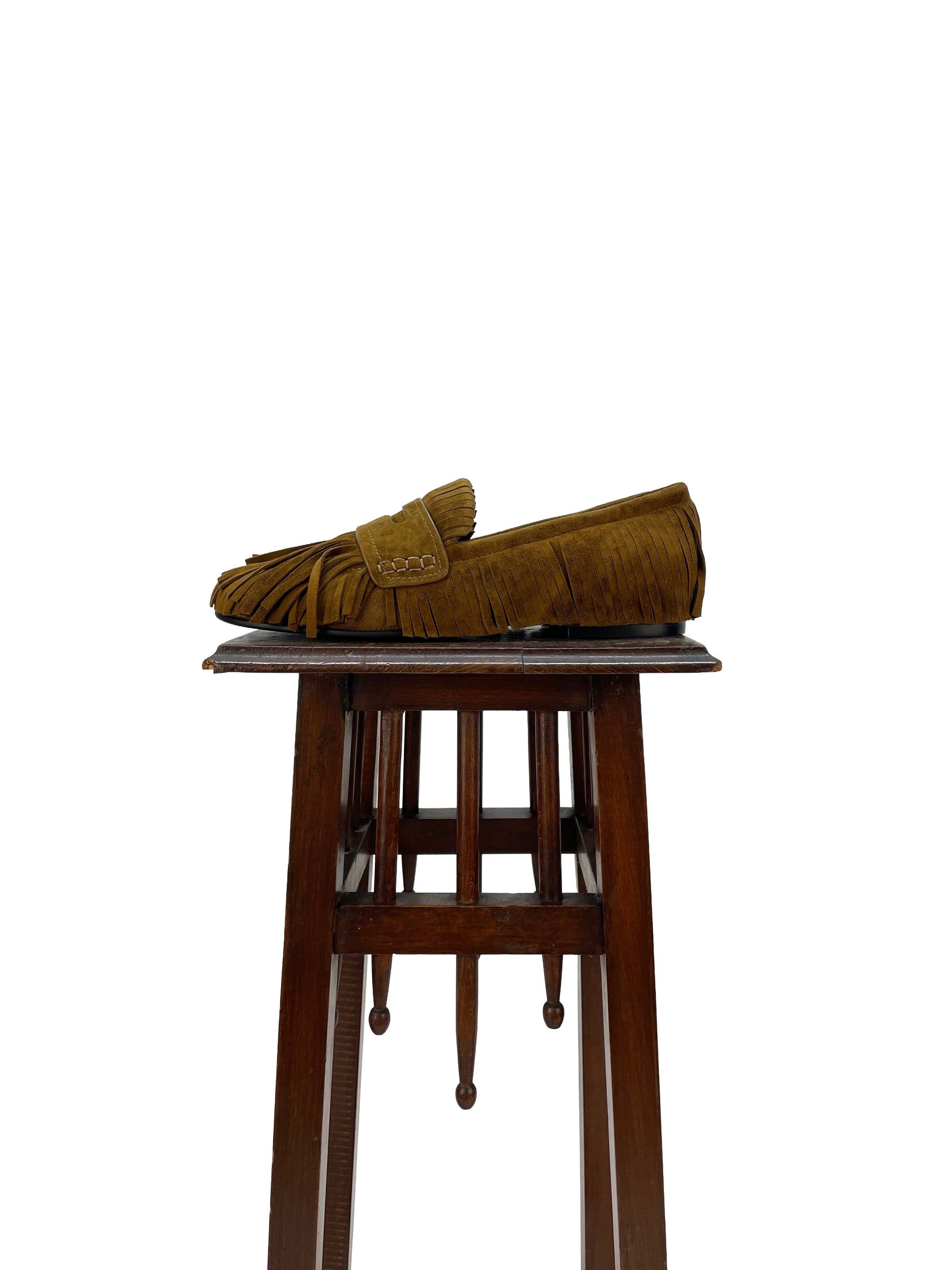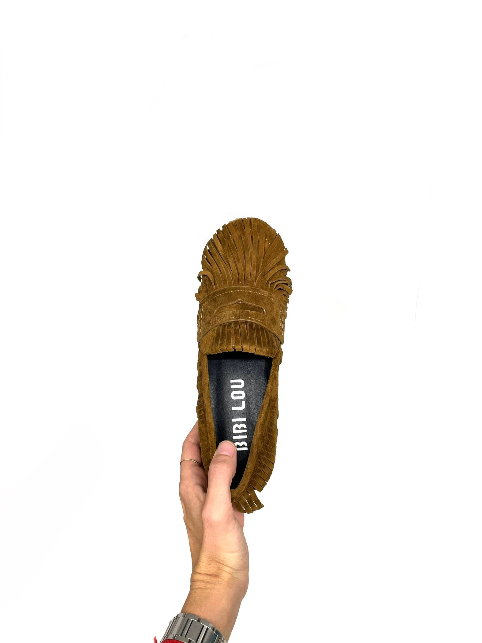 Loafer flat in camoscio color tabacco, interamente ricoperto di frange. Calzata leggermente comoda
