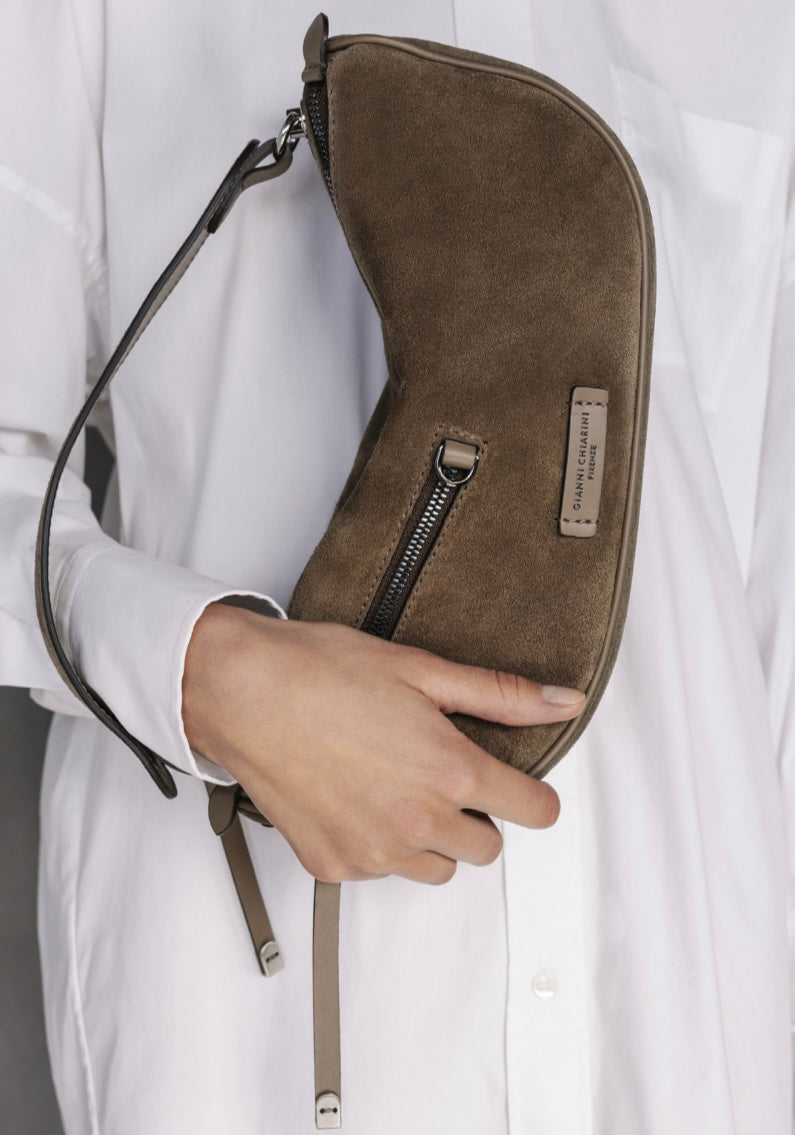 La nuova borsa Cindy by Gianni Chiarini Firenze, realizzata in pelle scamosciata, combina un look rock e urban con zip decorative e dettagli logati. Presenta una chiusura a cerniera, un manico in tono per l'uso a mano e una tasca frontale con zip. Completa di tracolla removibile per l'utilizzo crossbody, è perfetta per chi cerca uno stile audace e ricercato. Dimensioni: 30x16x8 cm.