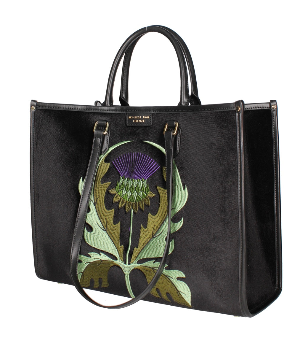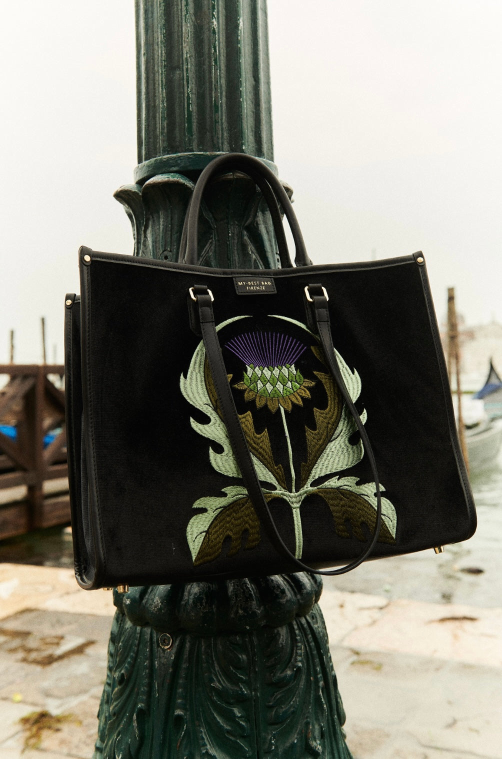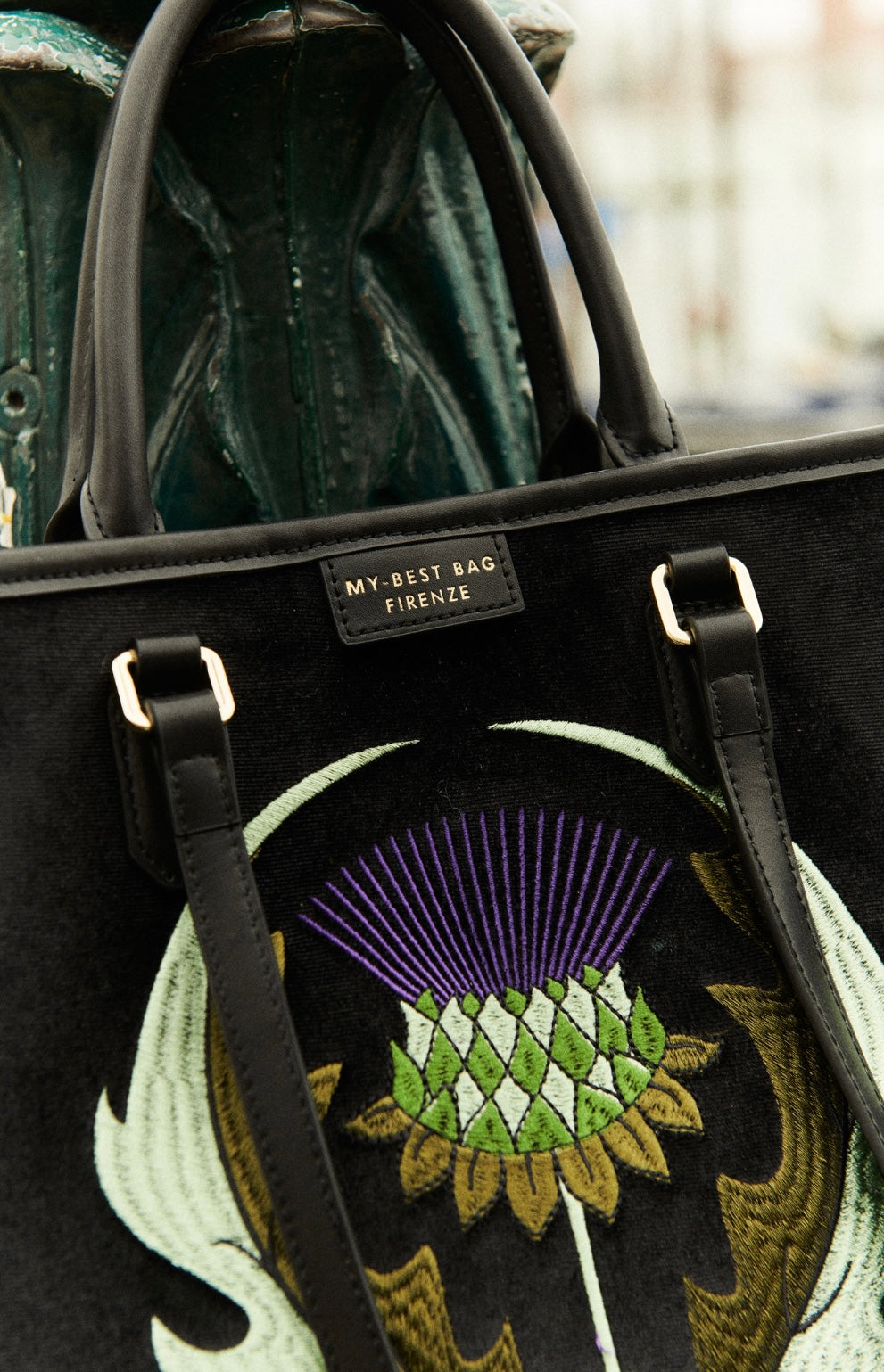Iconica shopper My Best Bag in velluto con ricami tema erbario. Profili in vera pelle. Doppio manico, pochette interna con cerniera e tracolla rimovibile.