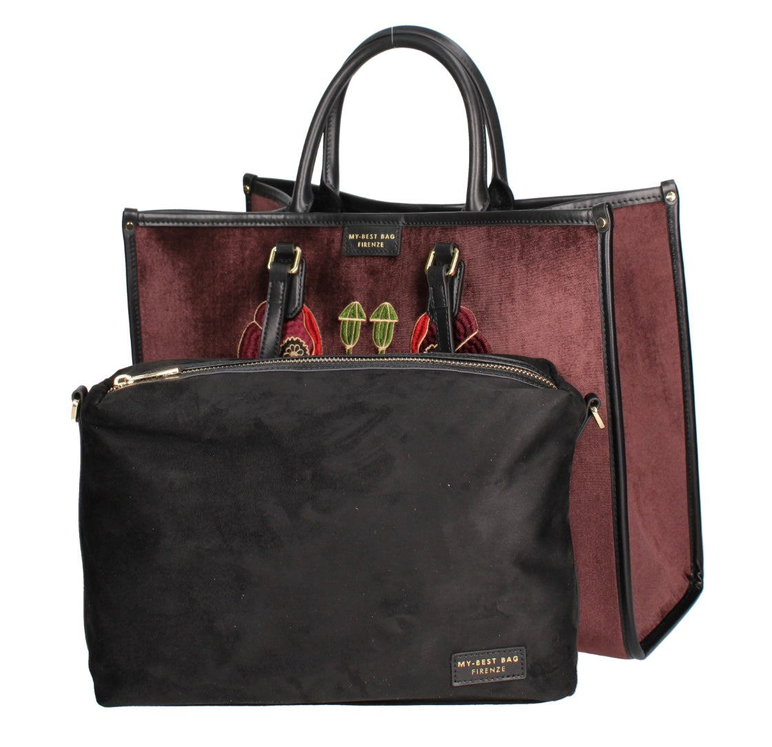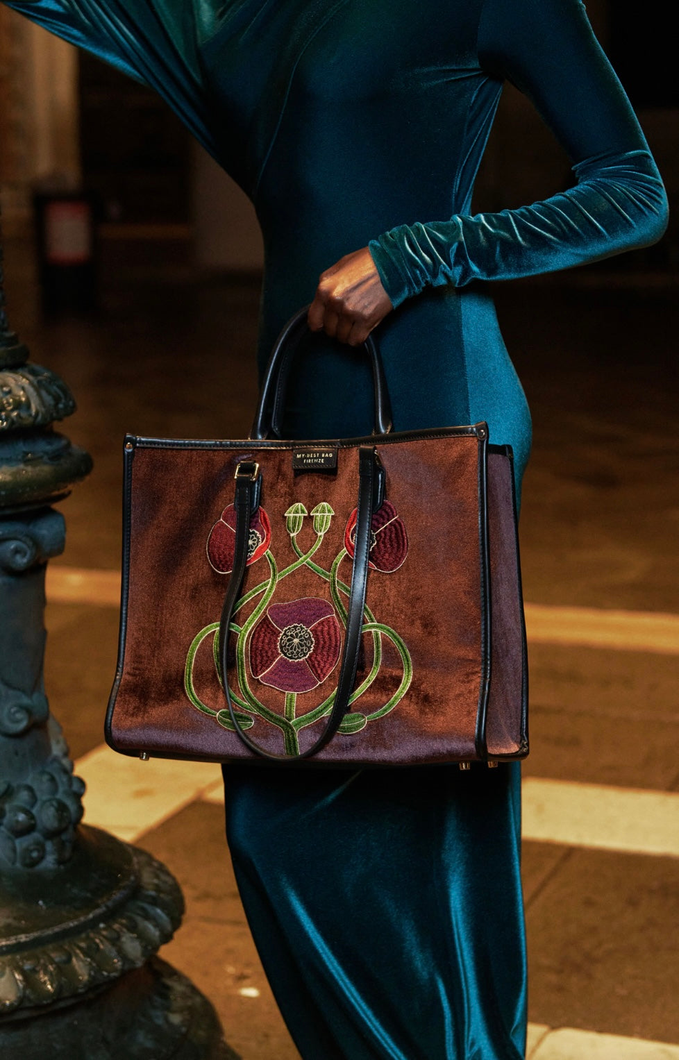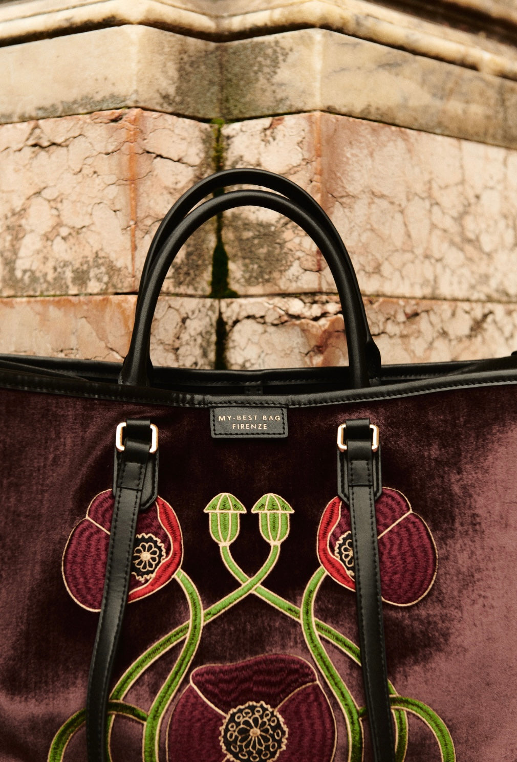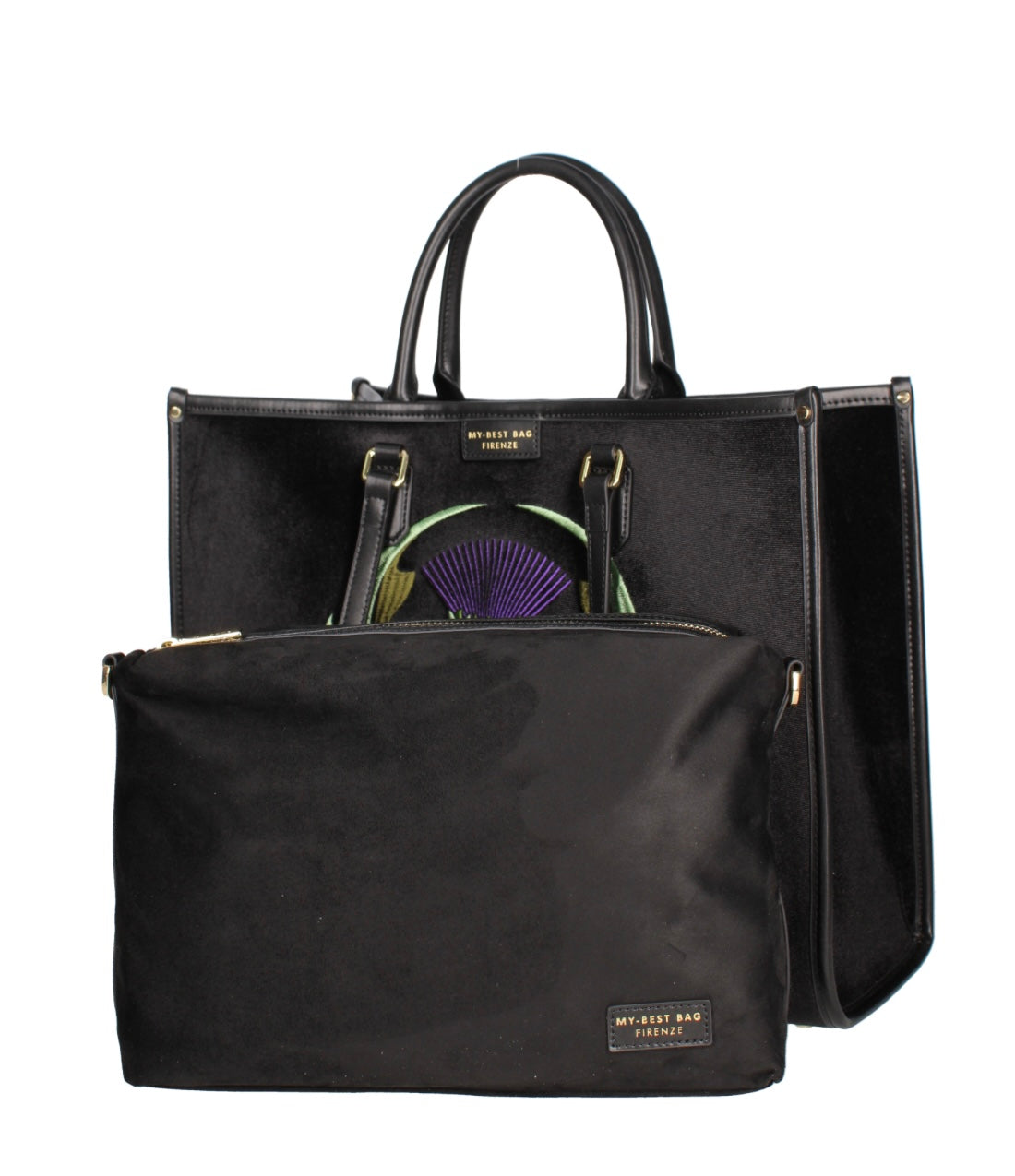 Iconica shopper My Best Bag in velluto con ricami tema erbario. Profili in vera pelle. Doppio manico, pochette interna con cerniera e tracolla rimovibile.