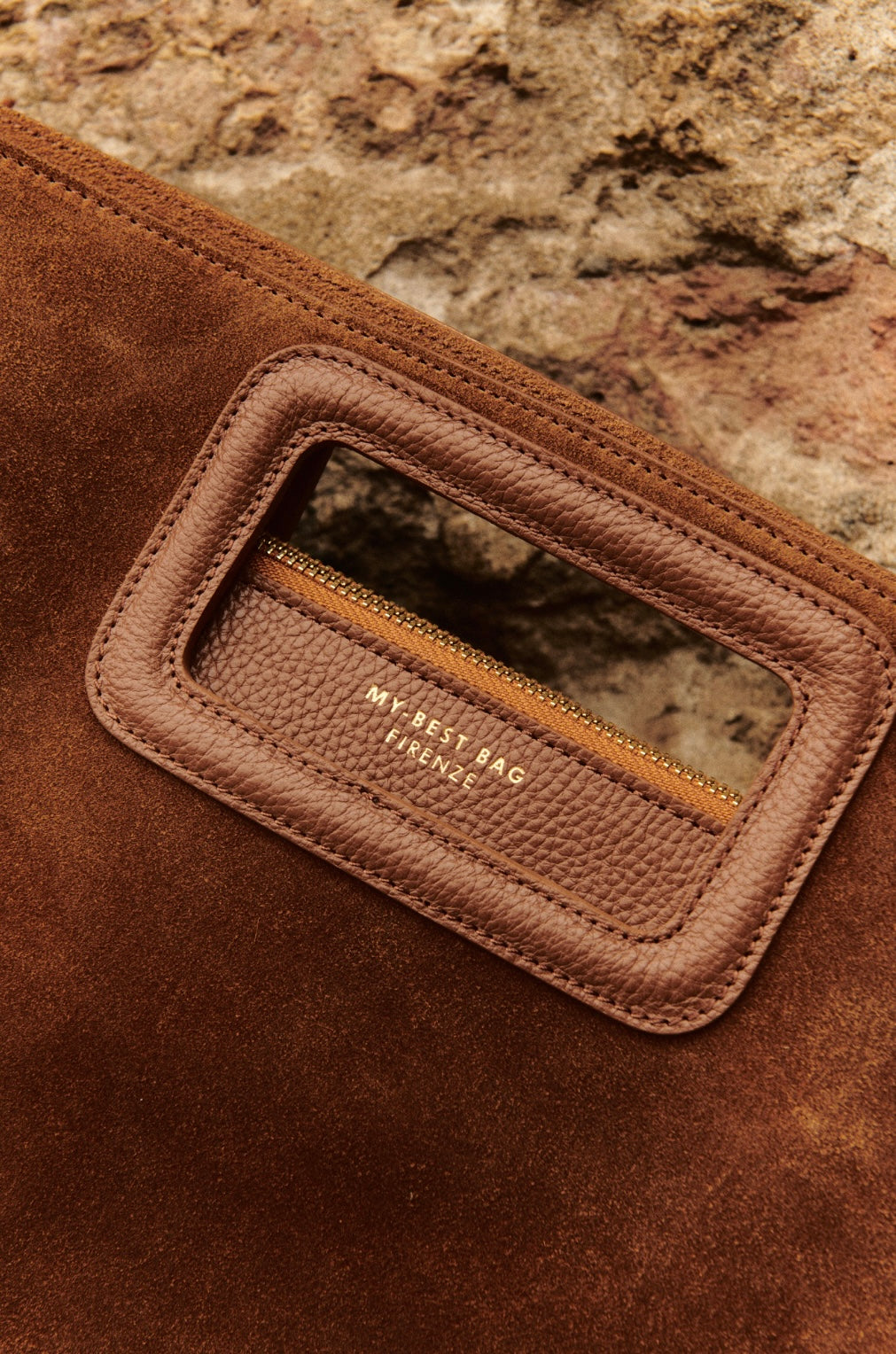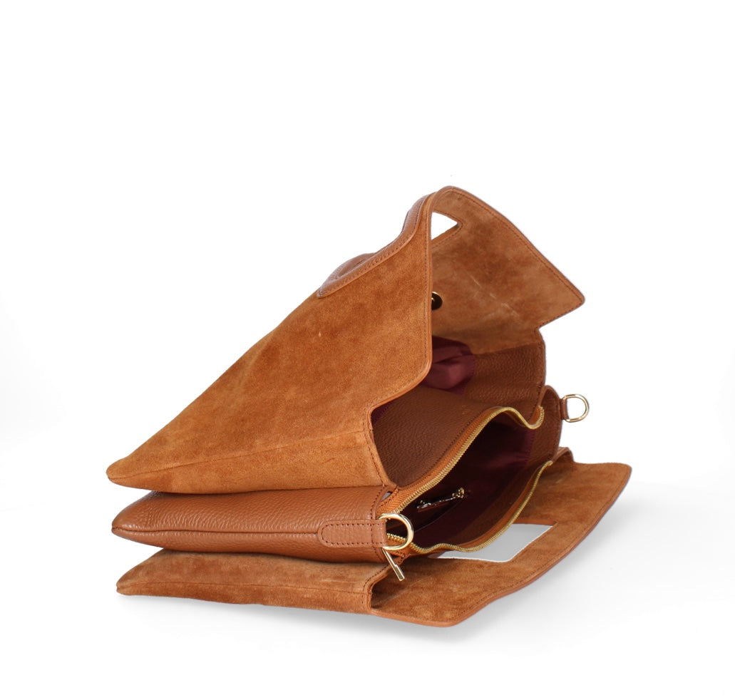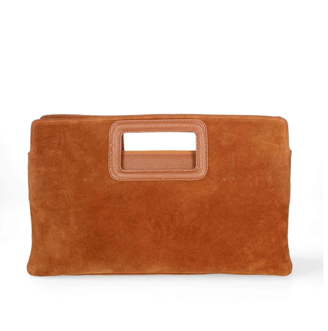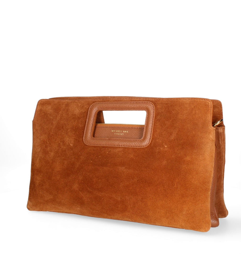 Clutch rettangolare con triplo scomparto. Disponibile in camoscio cuoio.