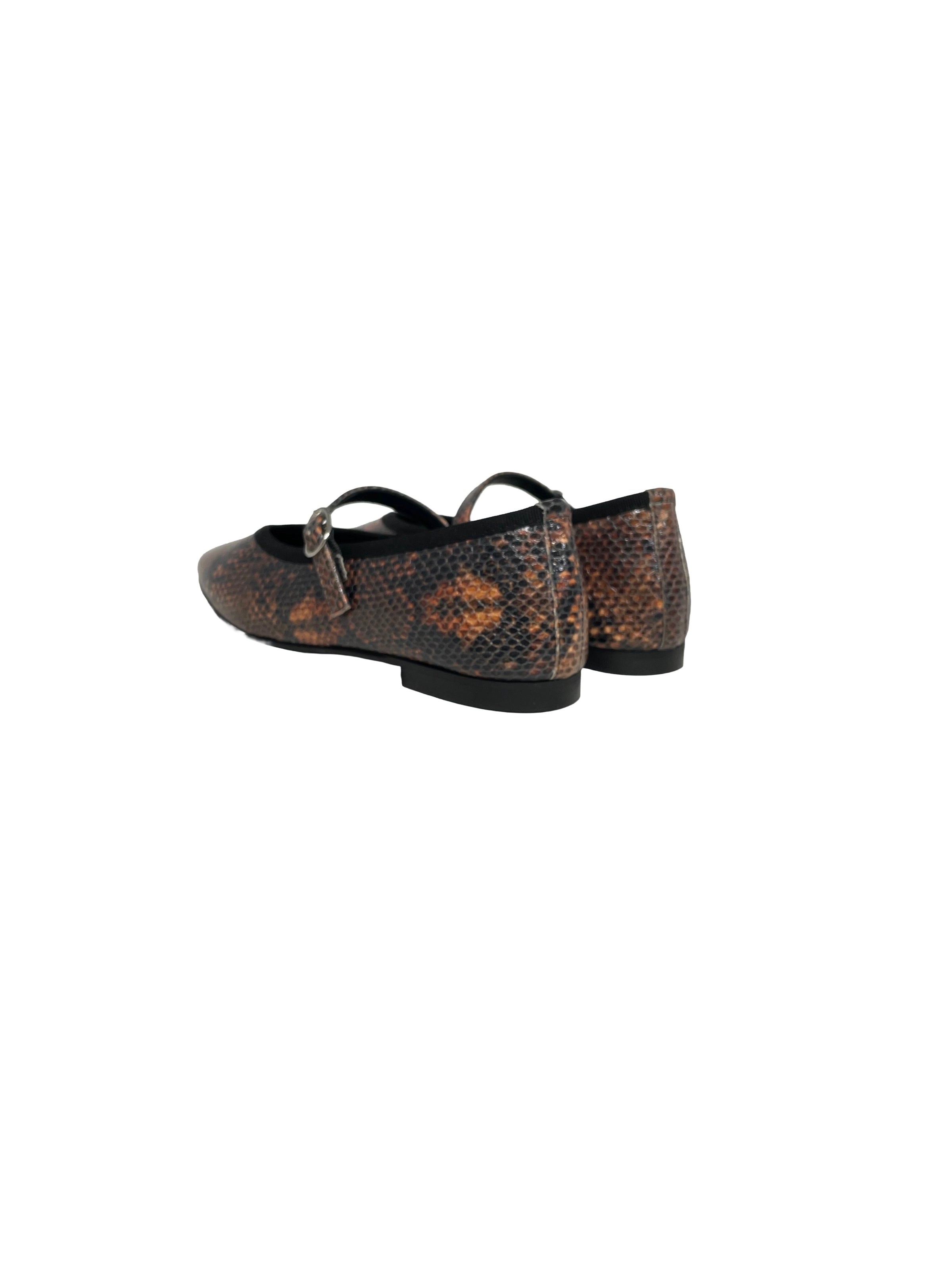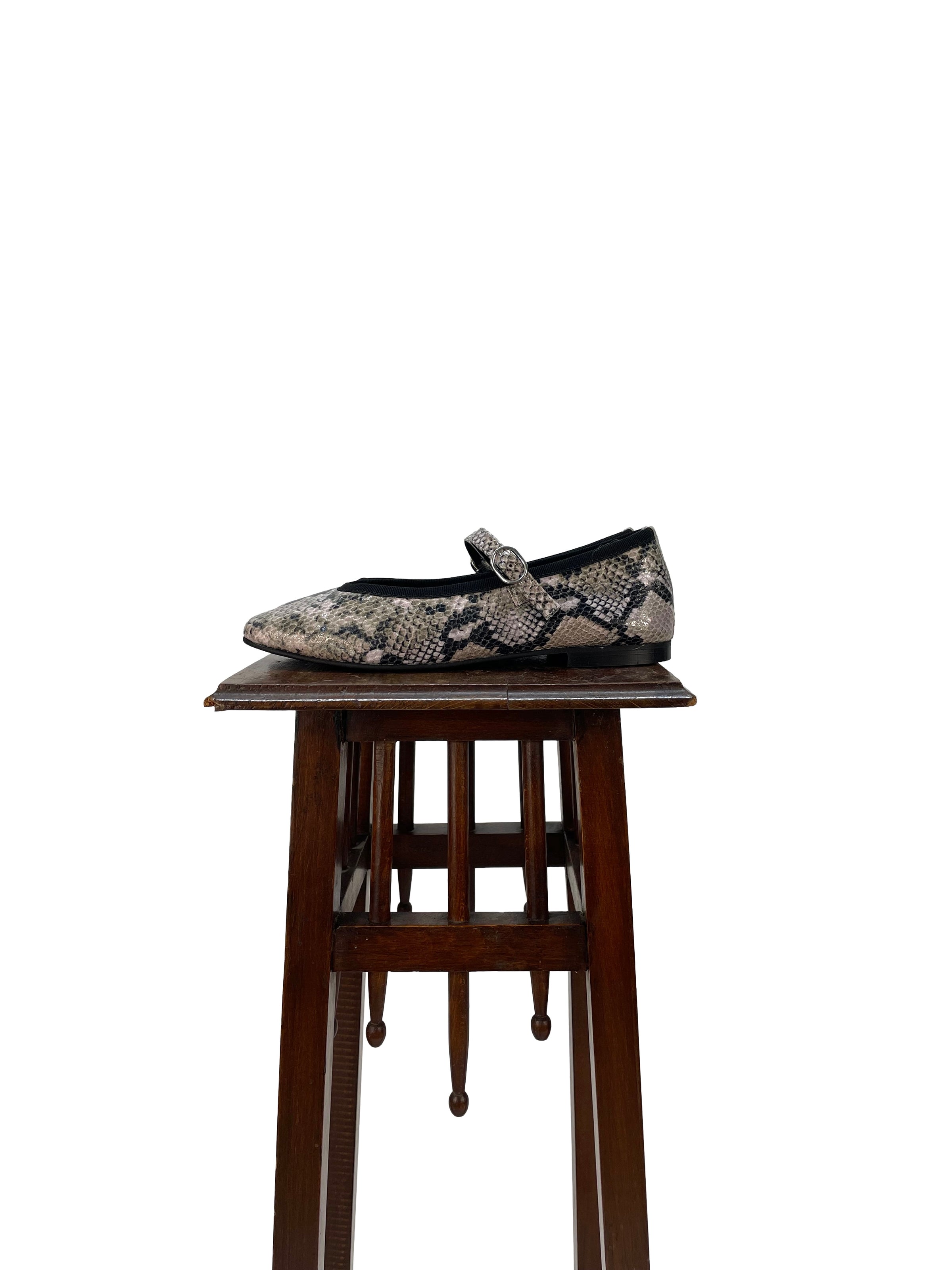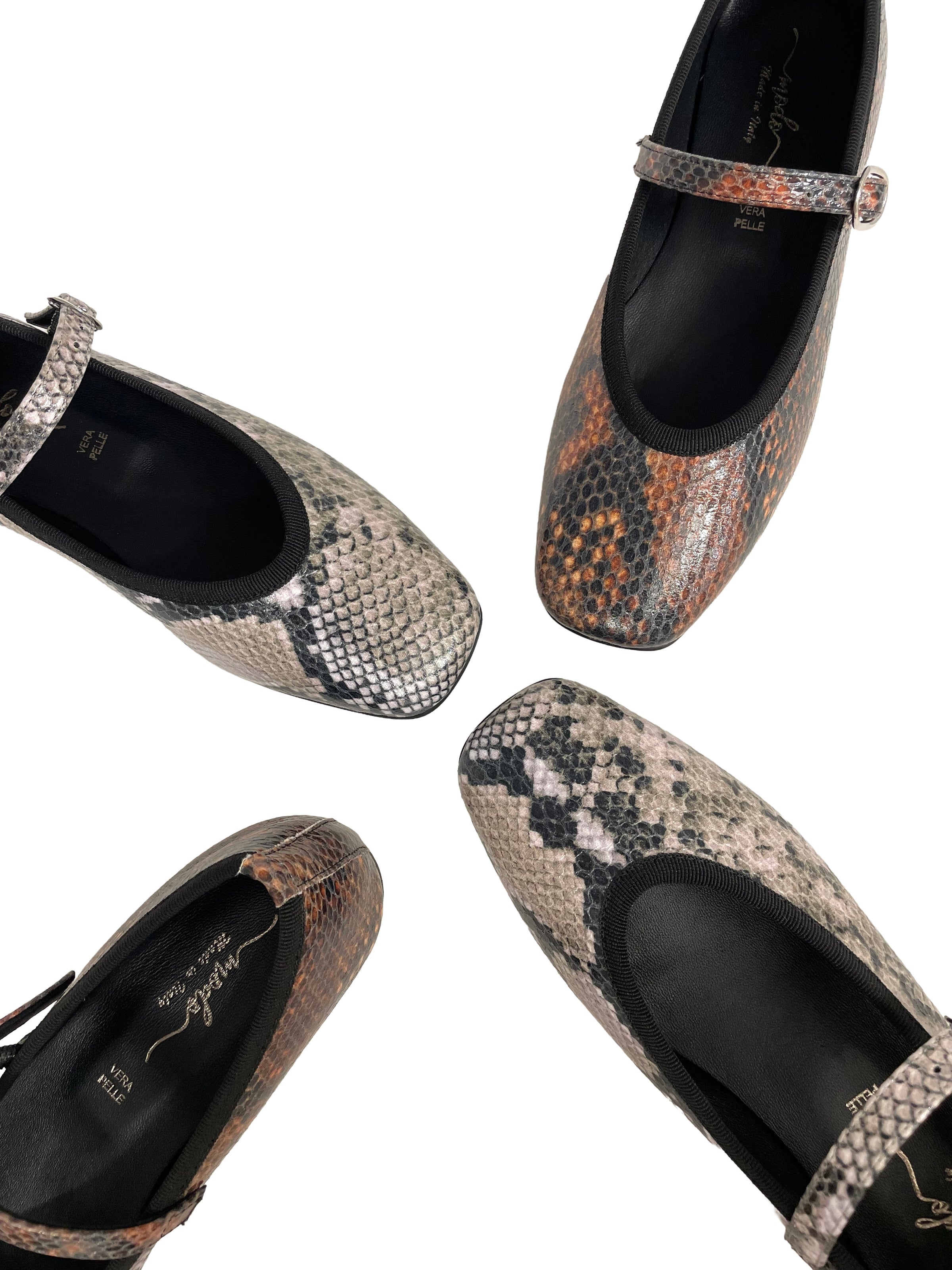 Variante della nostra Petra mary jane in pelle stampa effetto snake, grigio o caramello. Calzata leggermente abbondante.