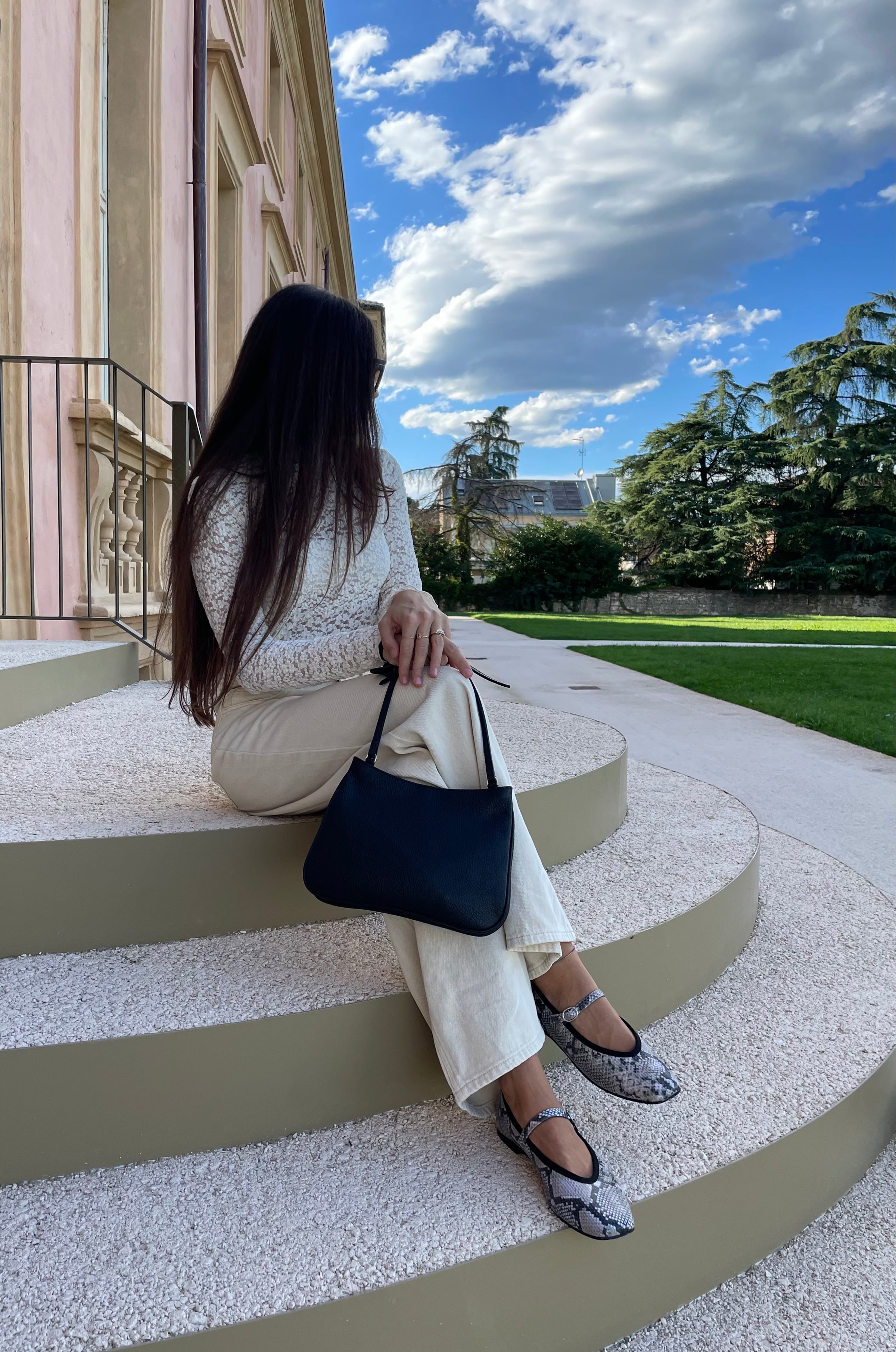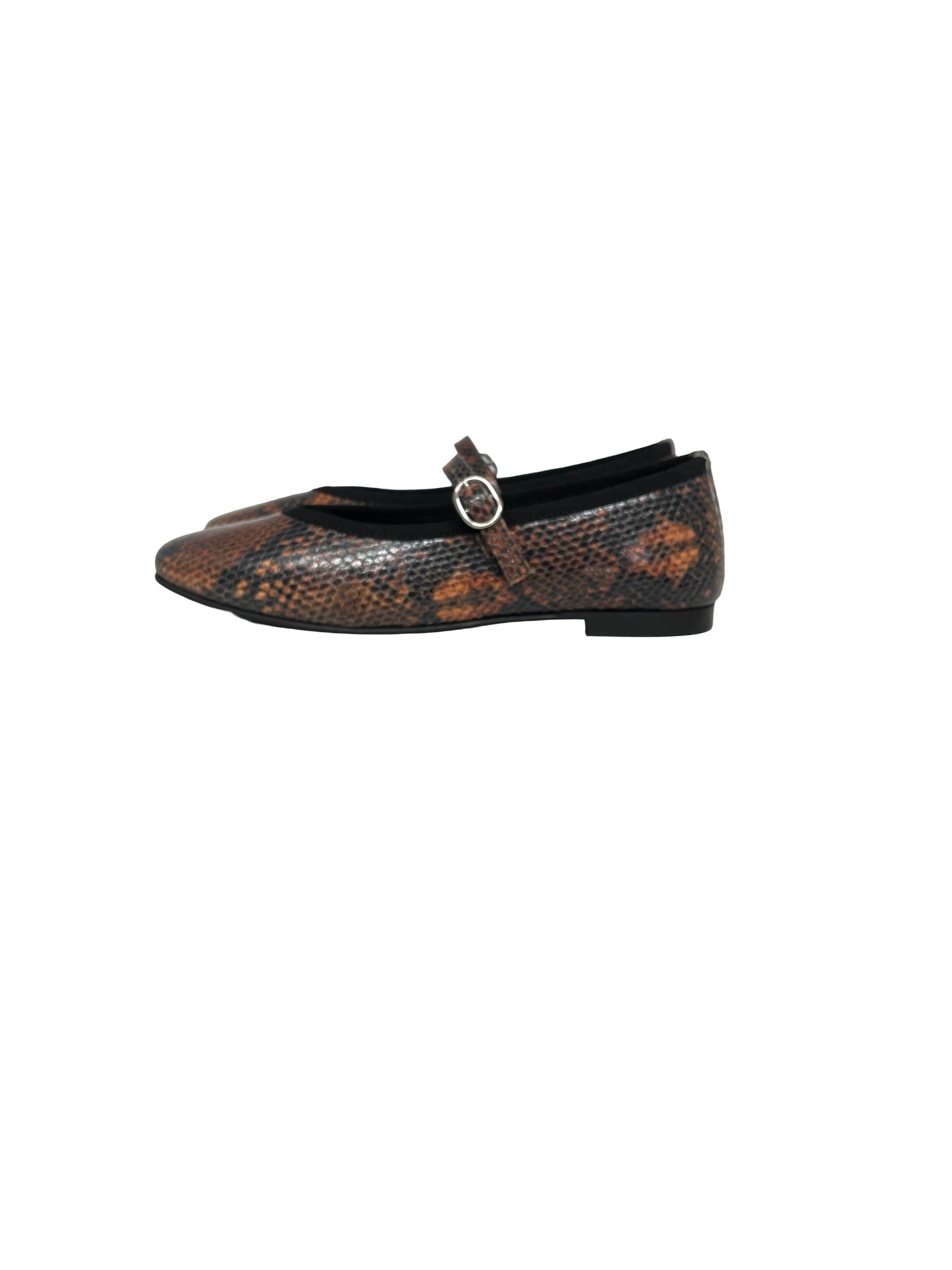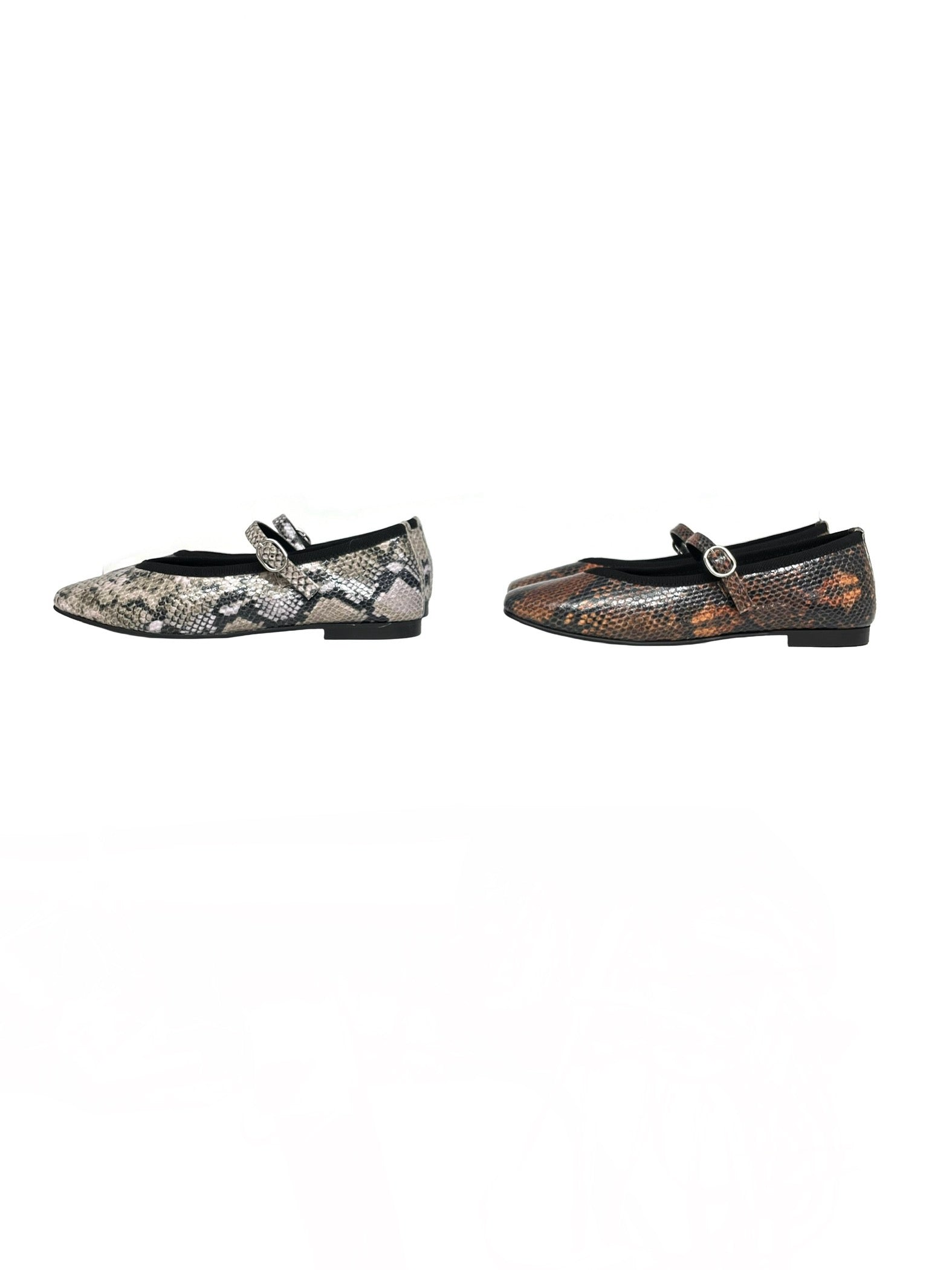 Variante della nostra Petra mary jane in pelle stampa effetto snake, grigio o caramello. Calzata leggermente abbondante.