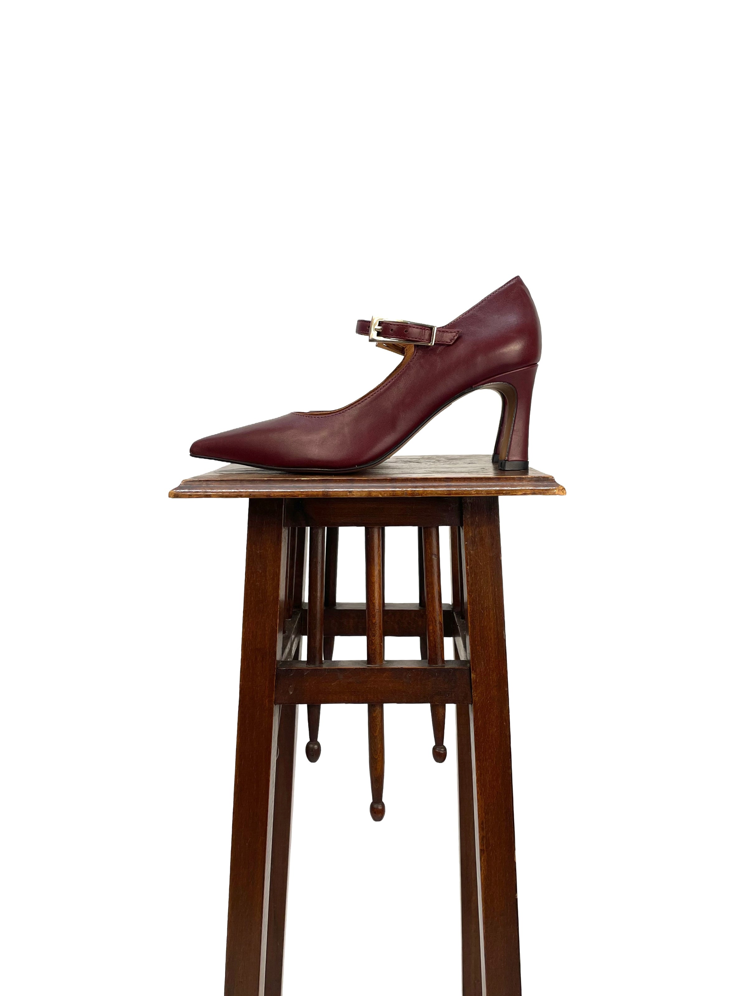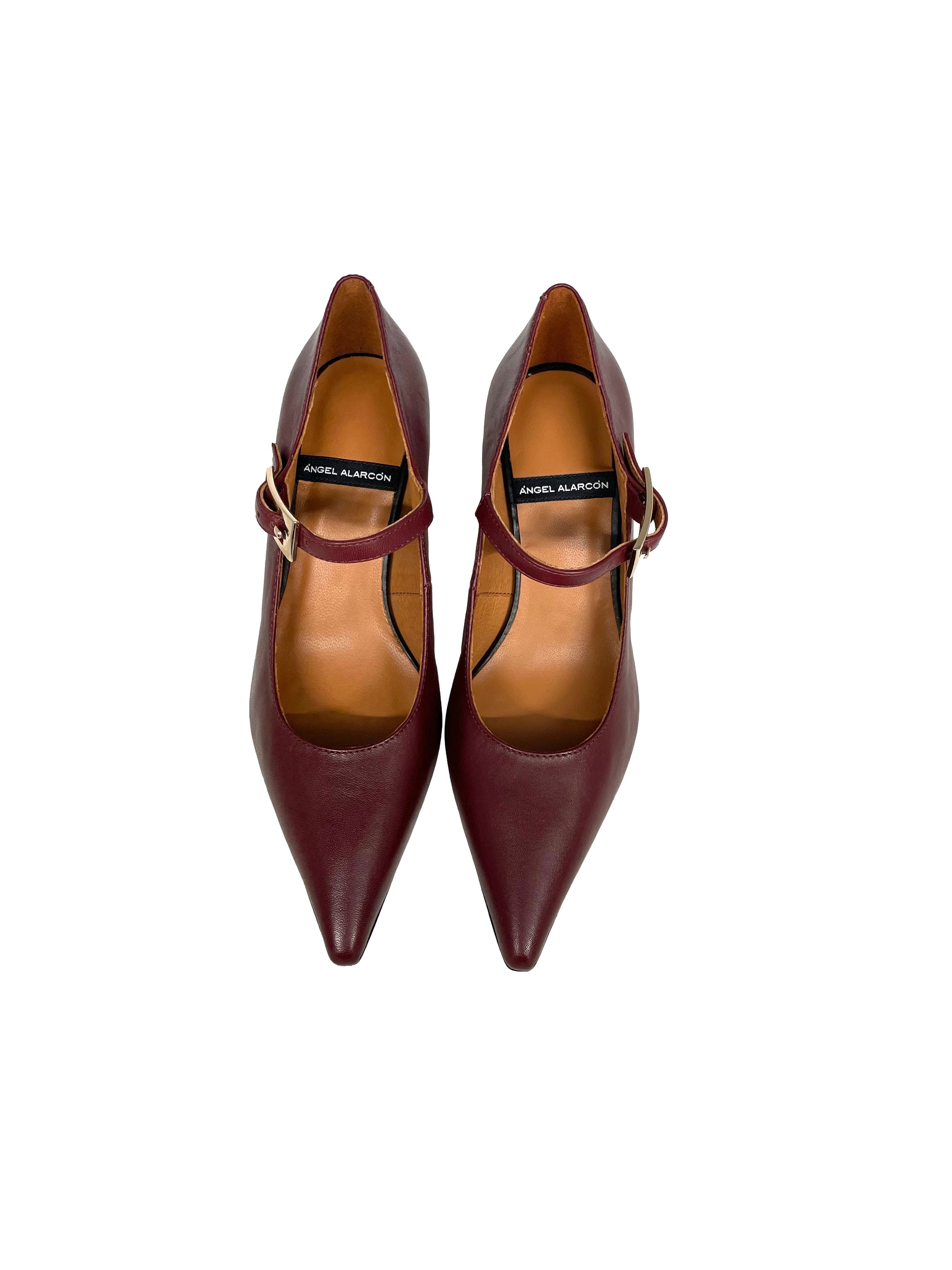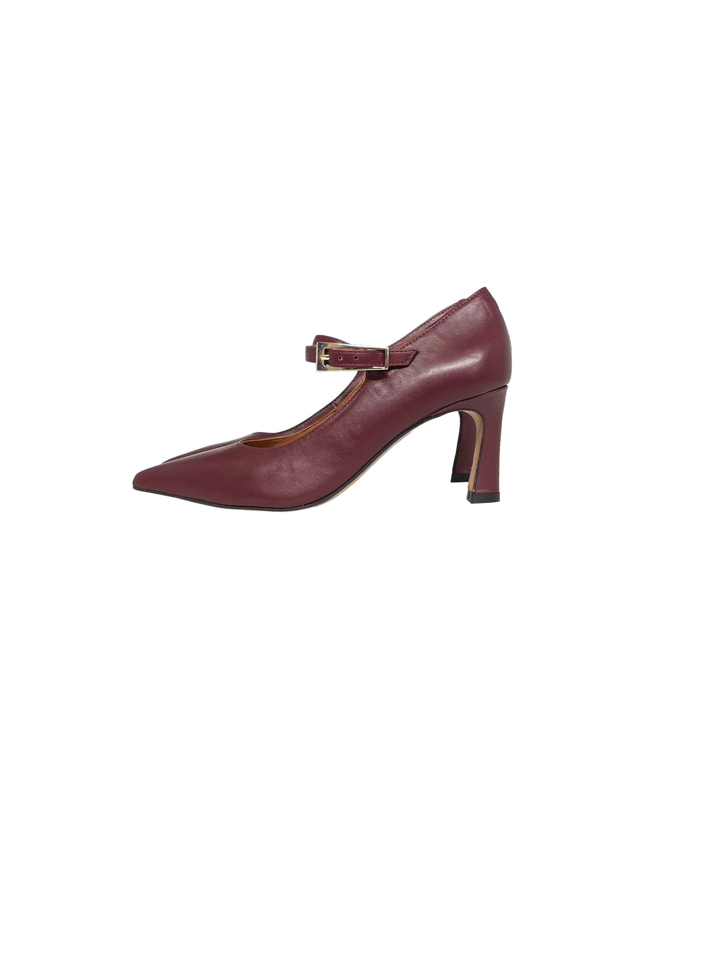 Mary jane con cinturino con fibbia dorata, tacco 6 cm. Disponibile in pelle nera e burgundy. Calzata regolare