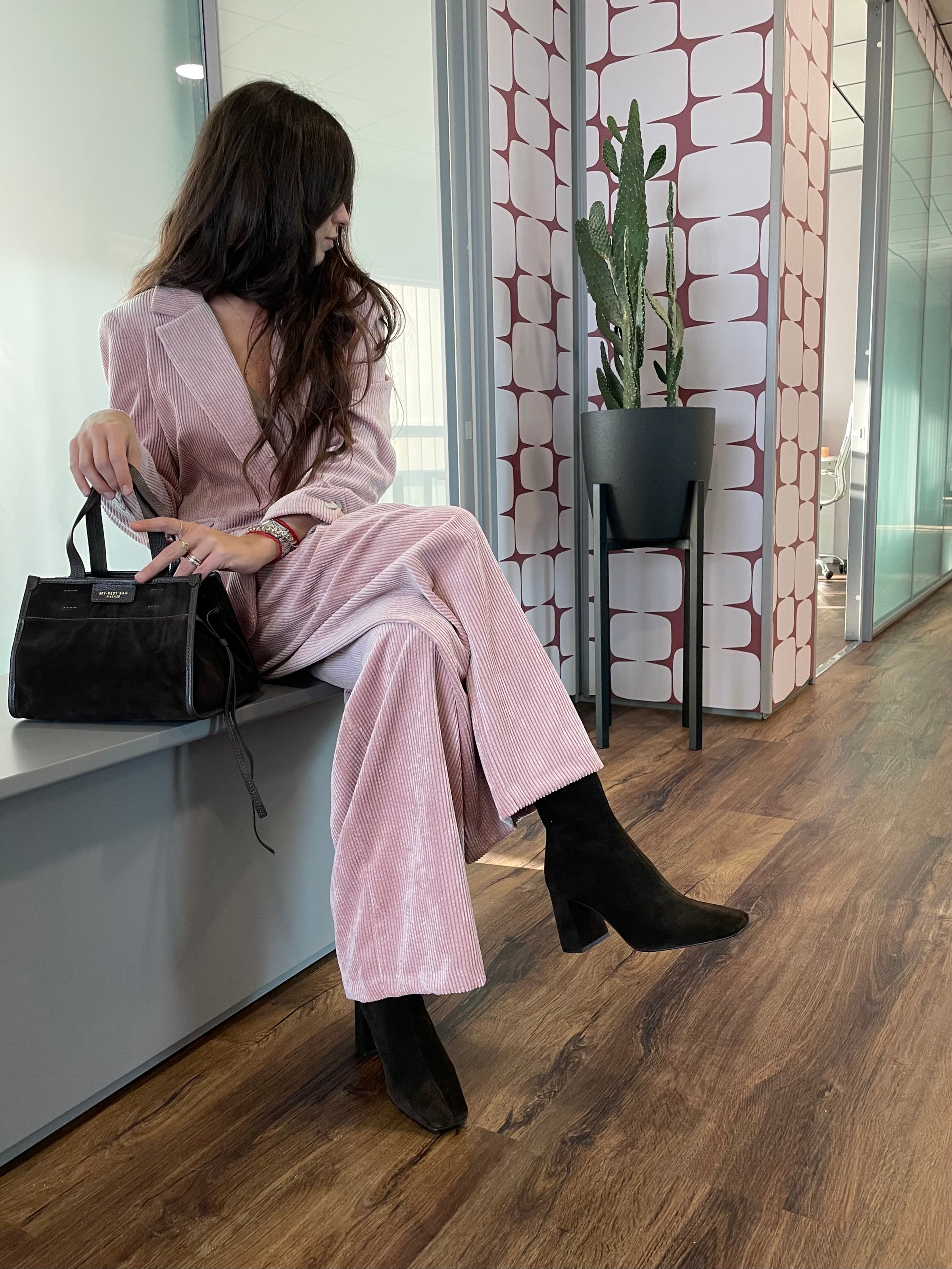 Bootie tacco medio di 5 cm, disponibile in pelle nera e in camoscio moro. Cerniera interna. Calzata regolare