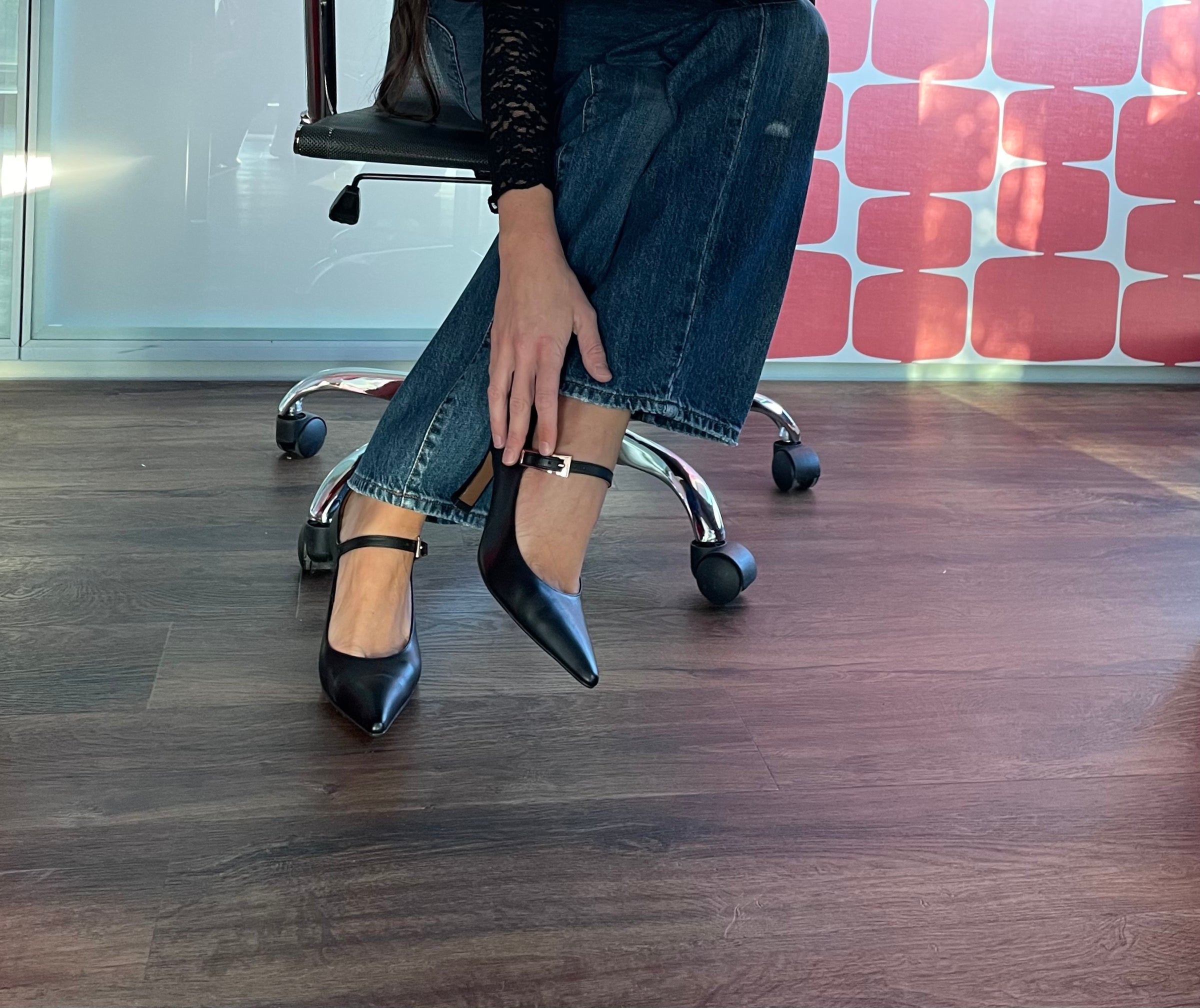 Mary jane con cinturino con fibbia dorata, tacco 6 cm. Disponibile in pelle nera e burgundy. Calzata regolare