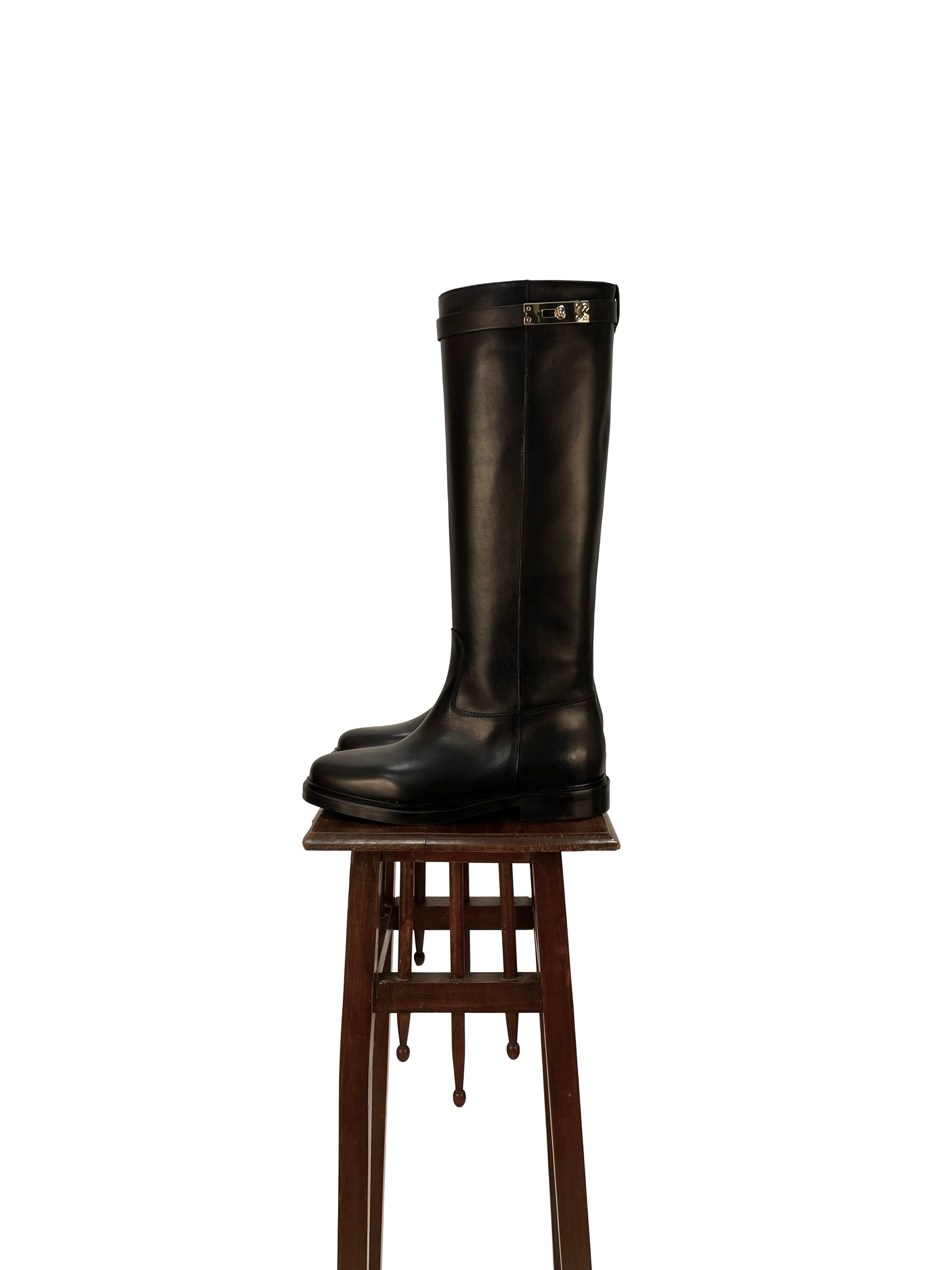 Stivale in pelle nera cavallerizzo con fibbia con chiusura dorata al polpaccio rimovibile. Calzata regolare.