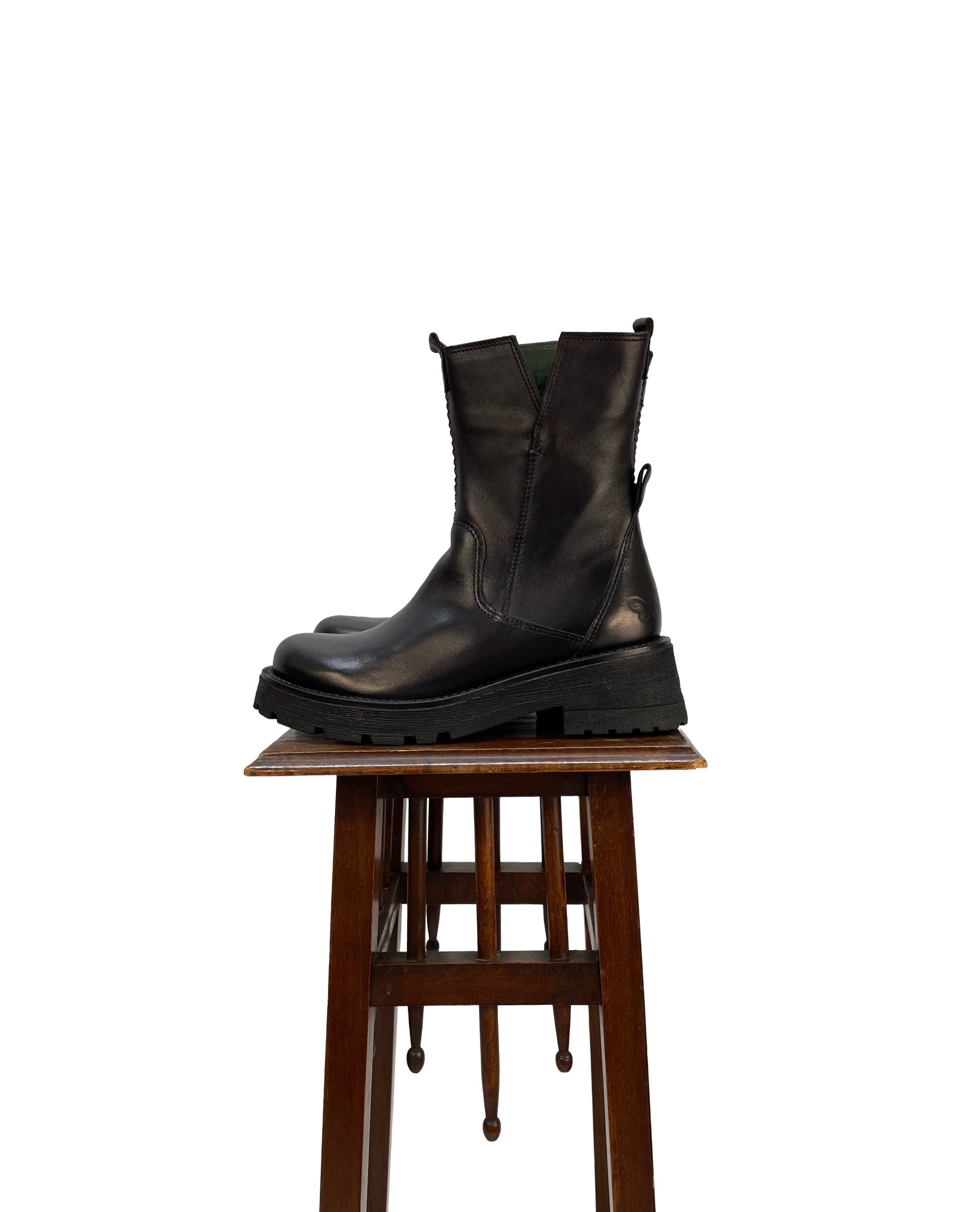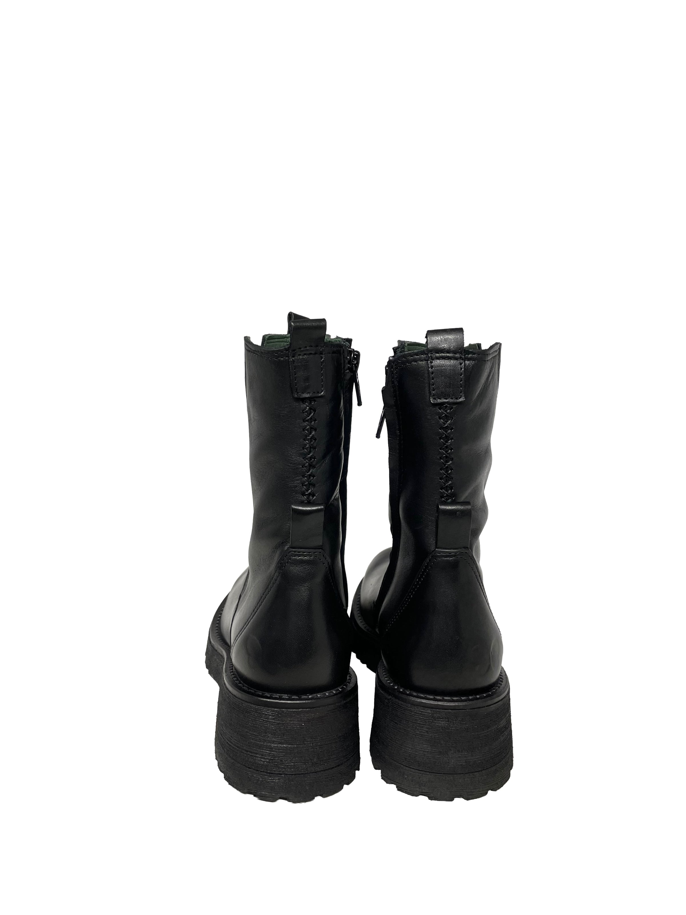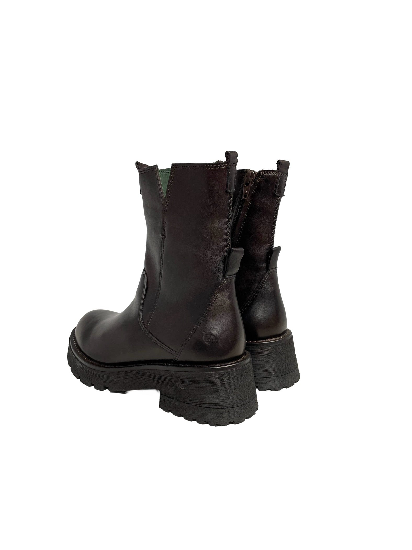 Bootie con fondo chuncky in gomma, taglio V laterale e cerniera interna. Calzata regolare.
