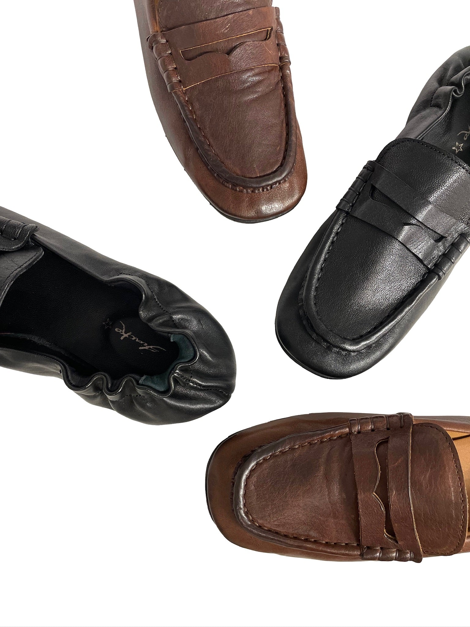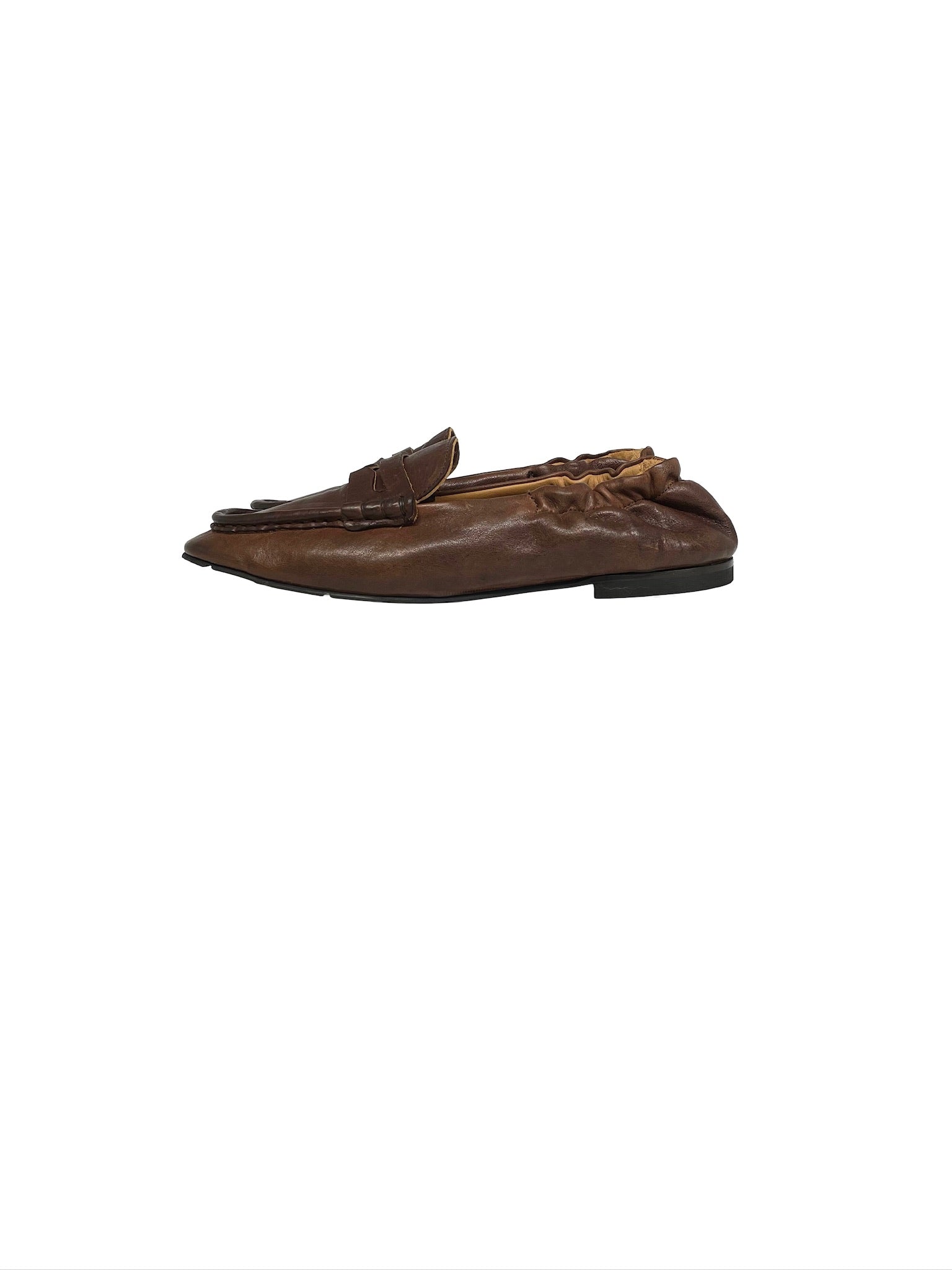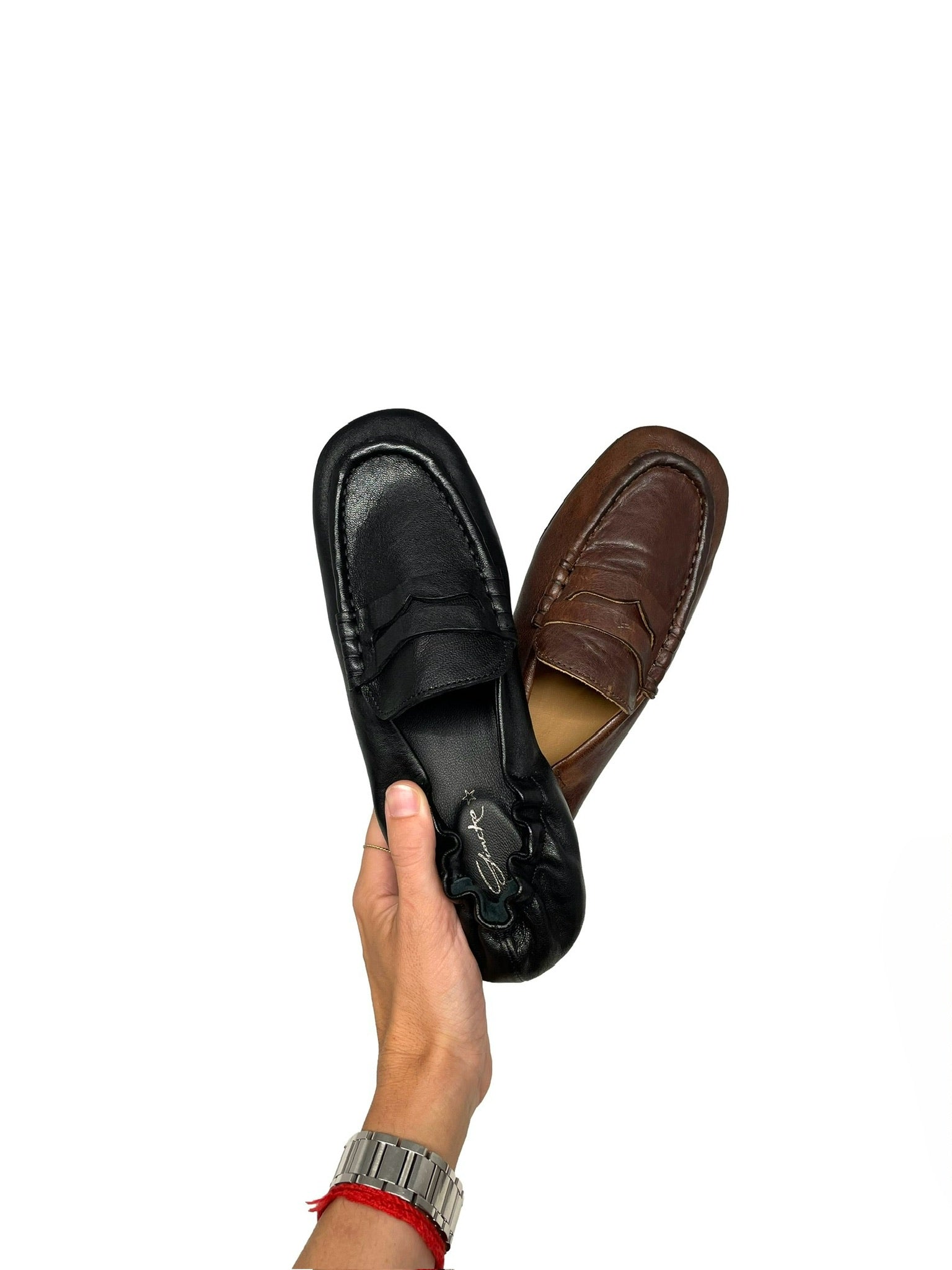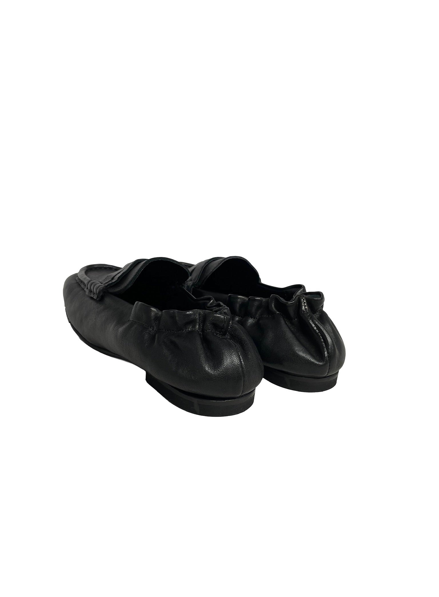 Mocassino in morbida pelle effetto vintage, con arricciatura elastica sul retro. Disponibile in nero e marrone. Calzata leggermente abbondante.