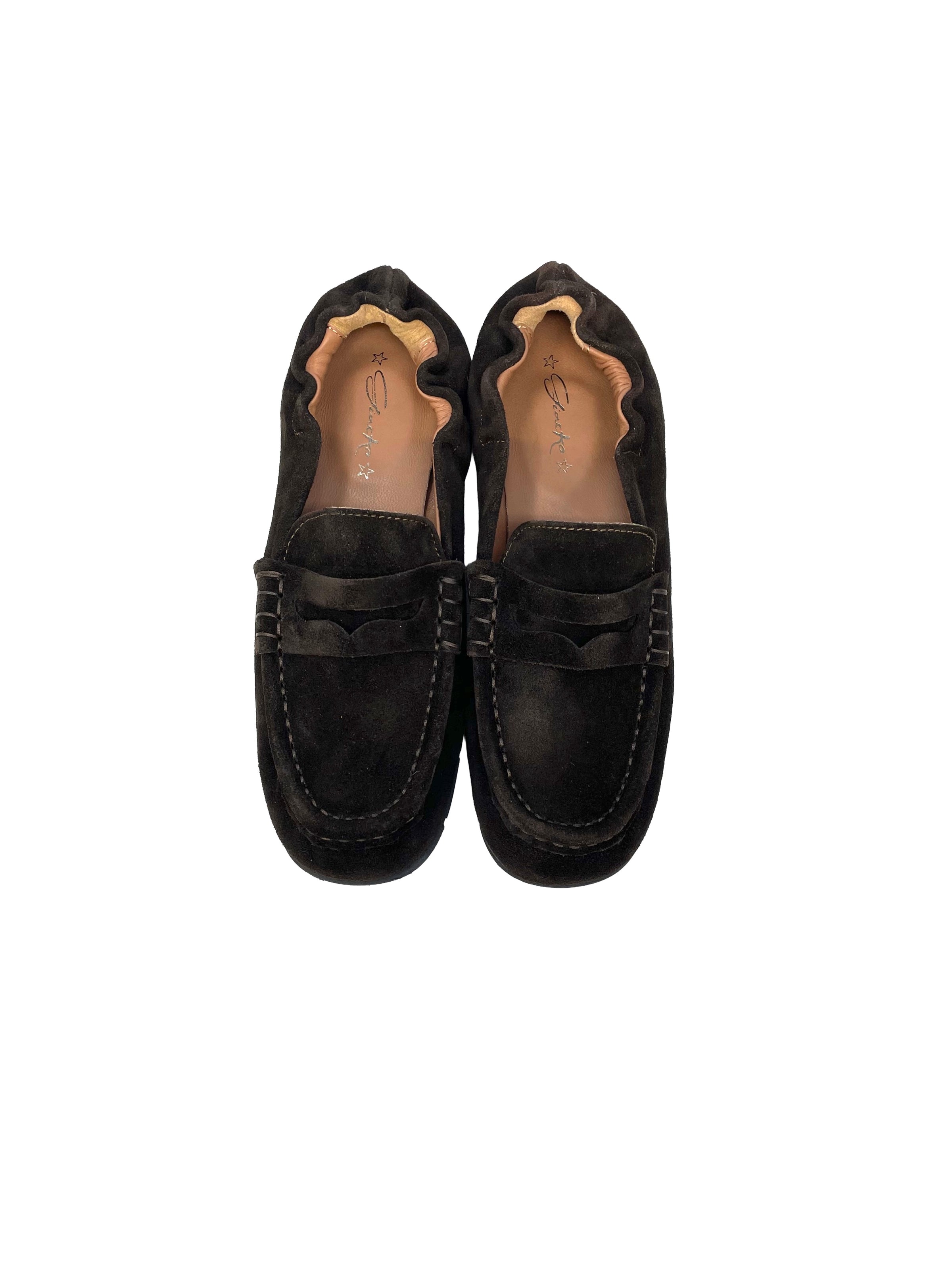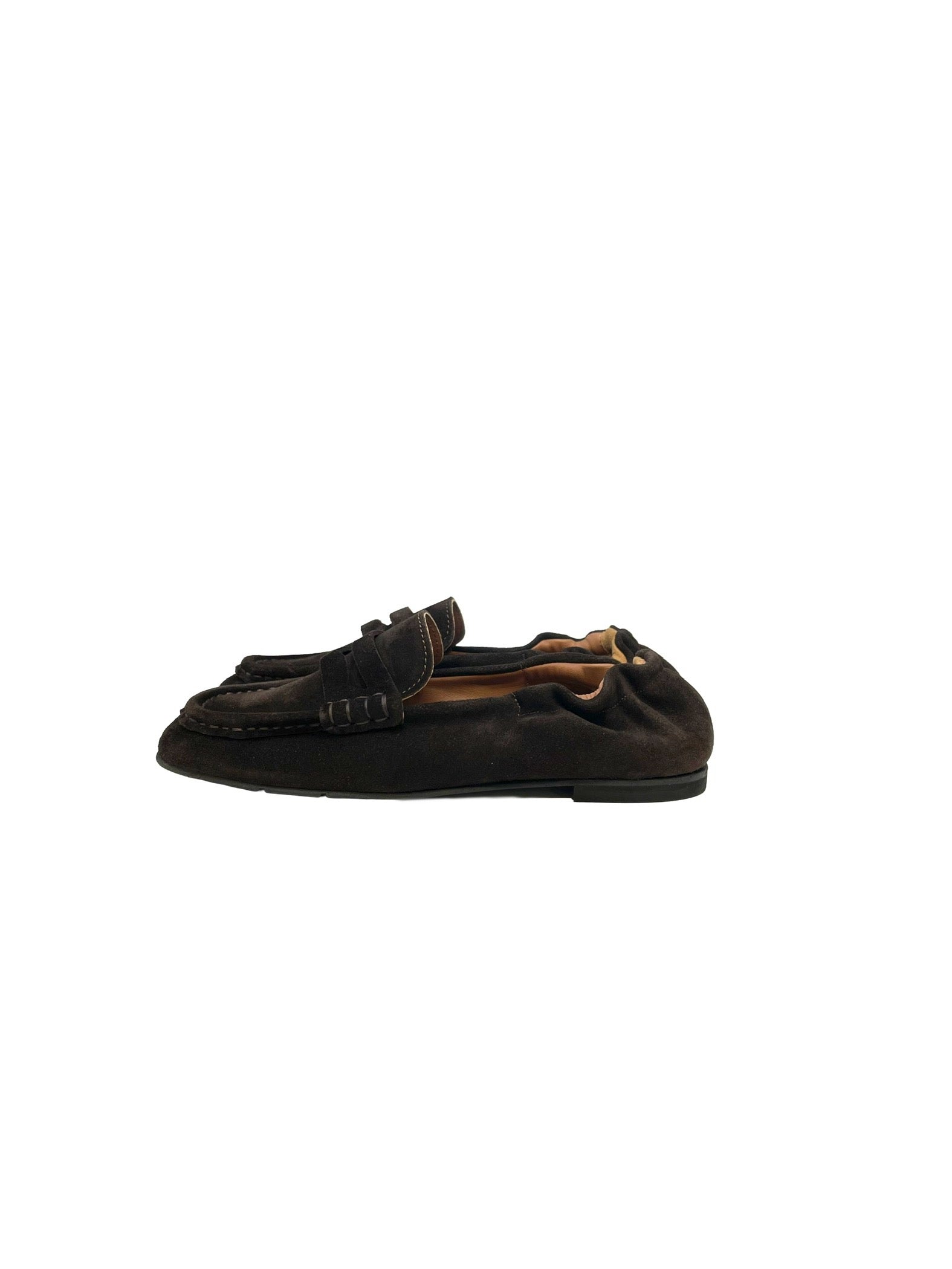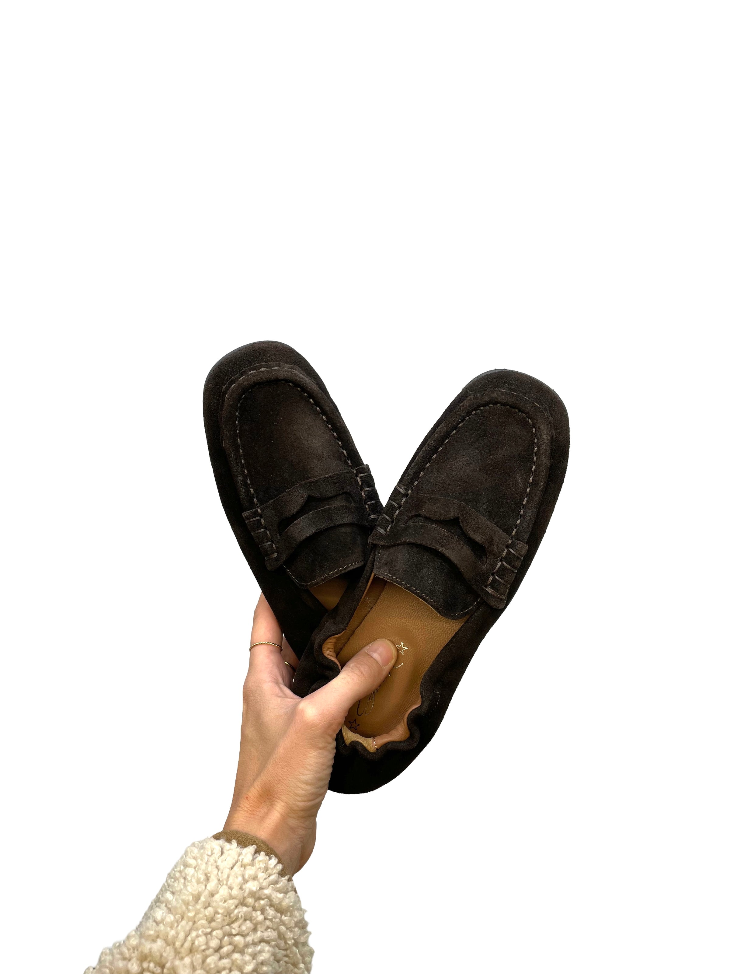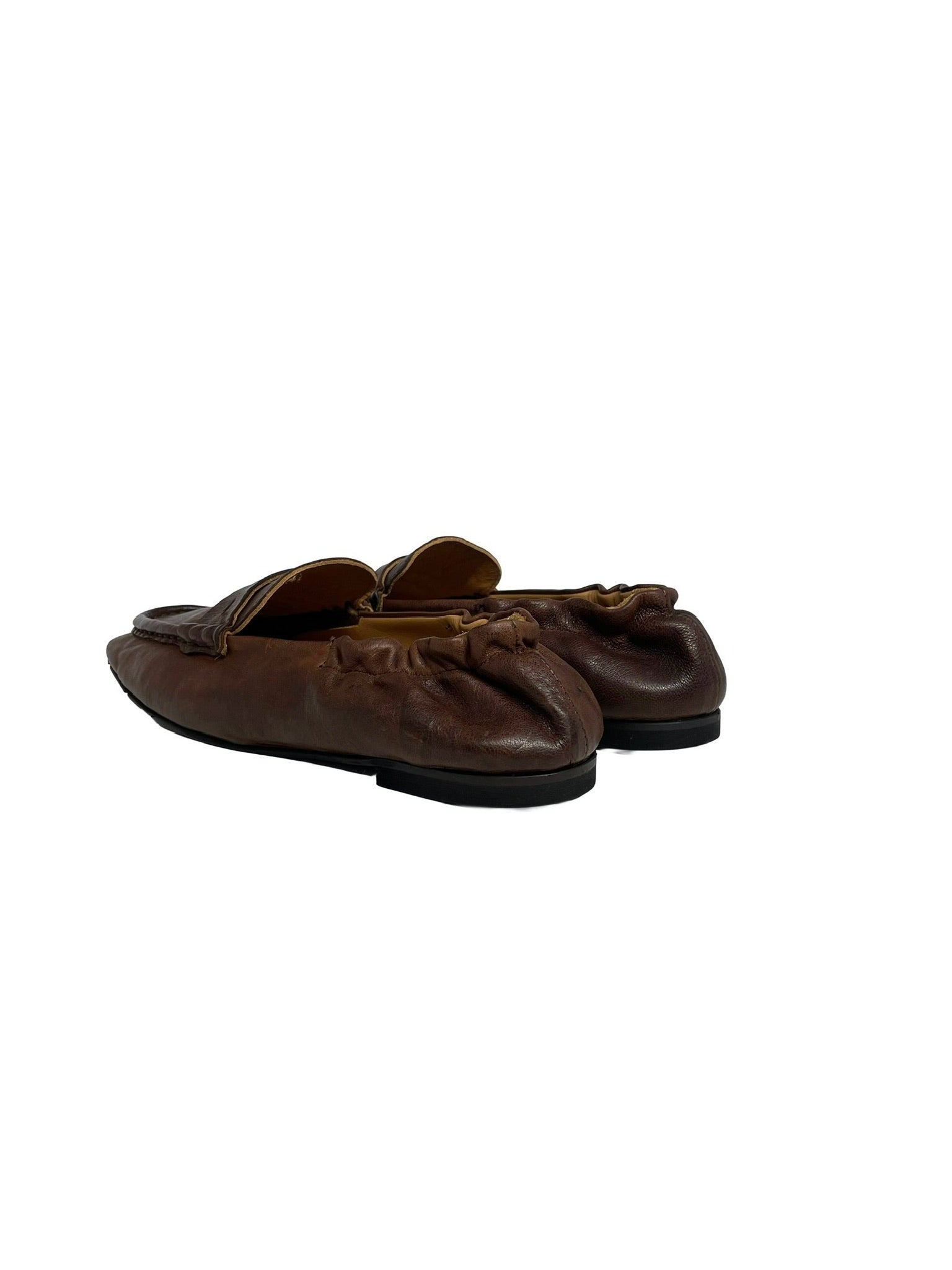 Mocassino in morbida pelle effetto vintage, con arricciatura elastica sul retro. Disponibile in nero e marrone. Calzata leggermente abbondante.