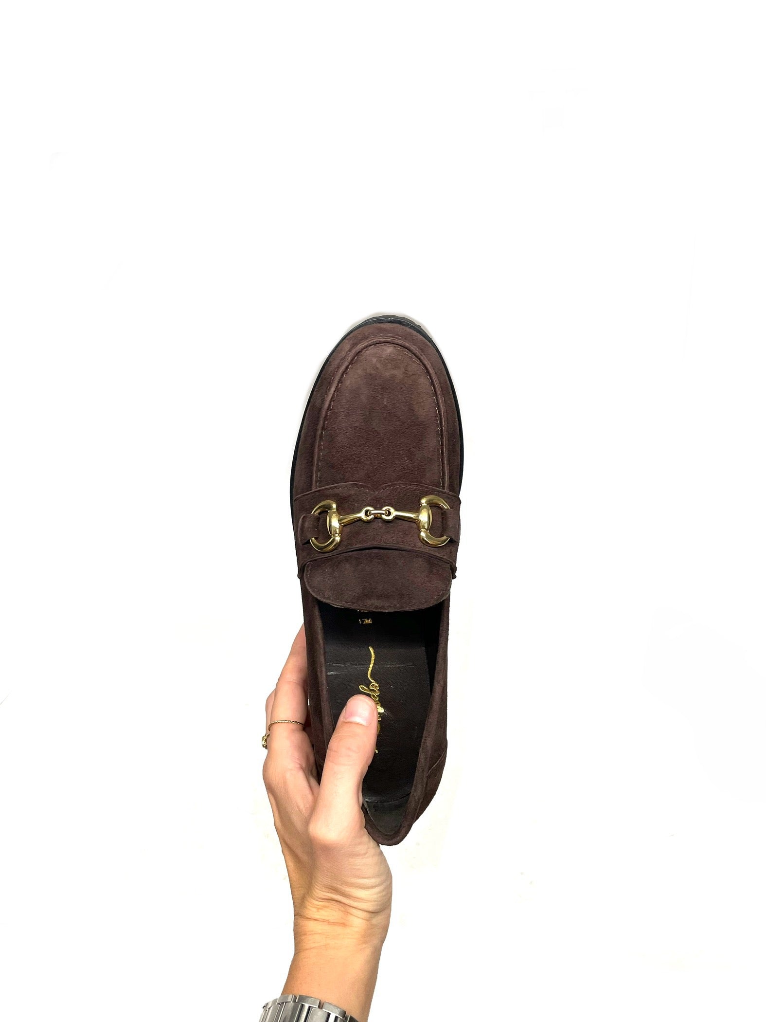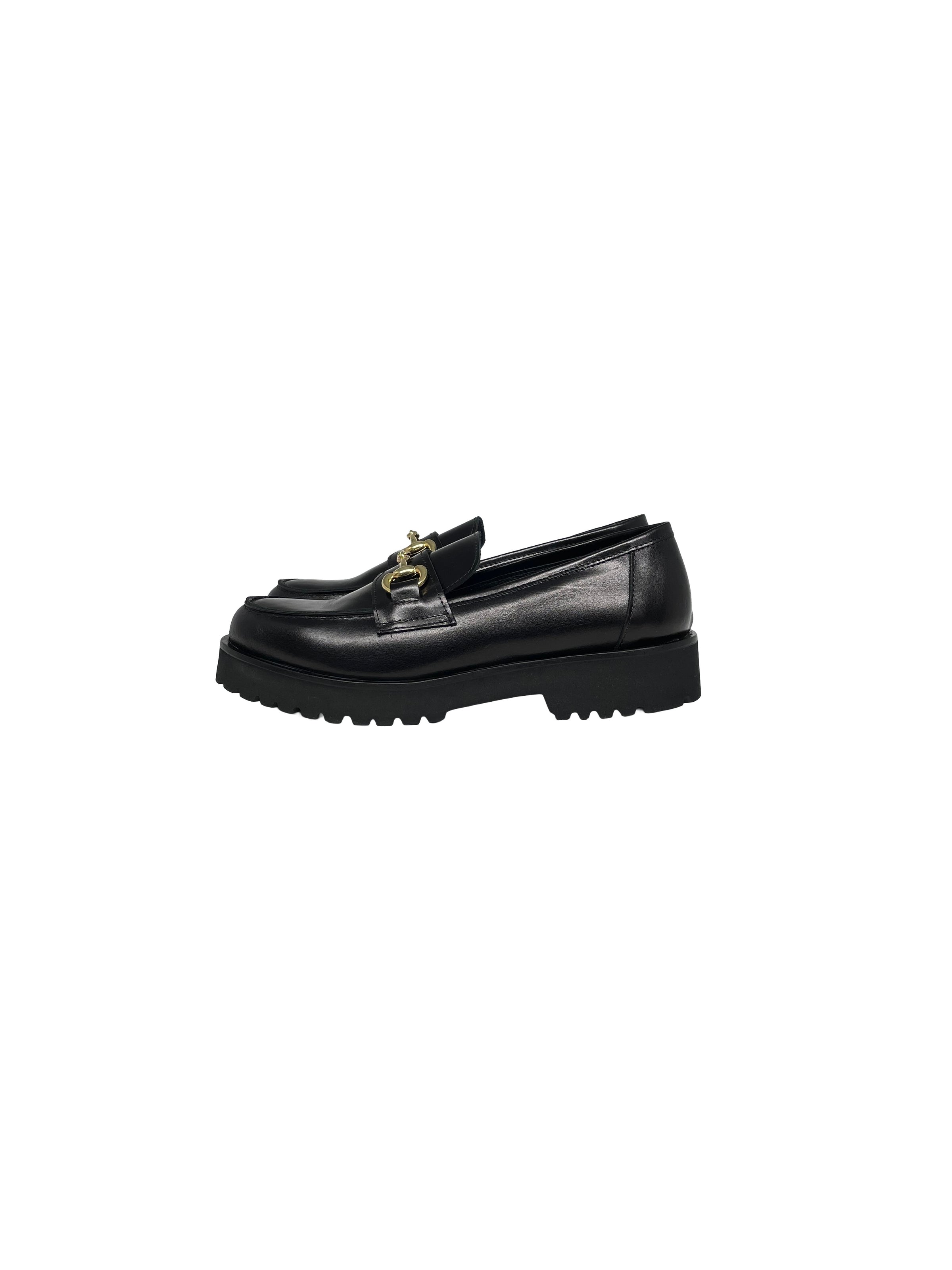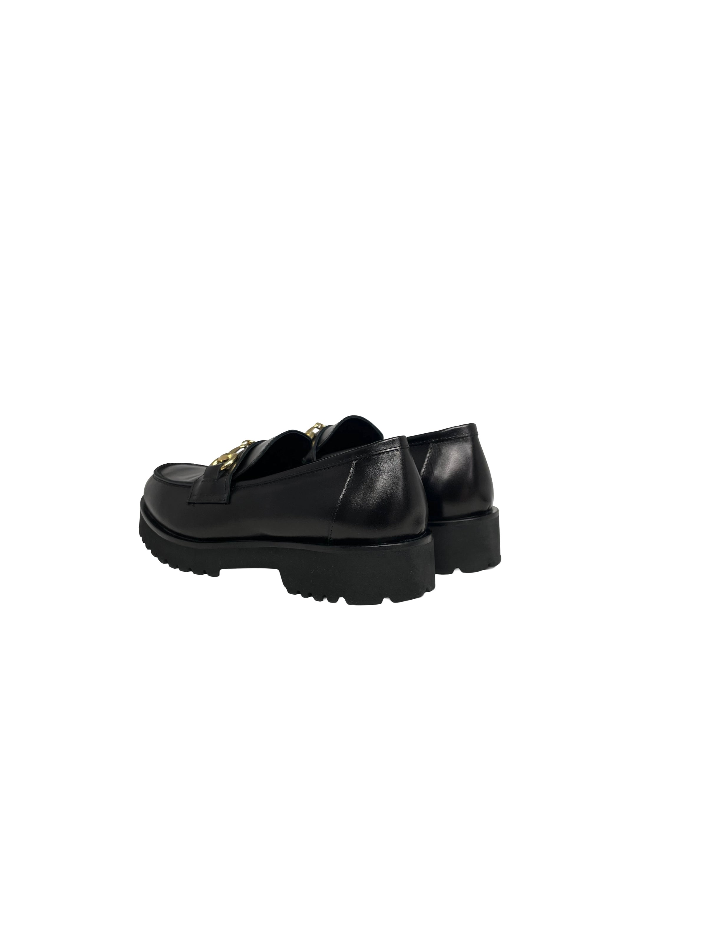 Mocassino con morsetto dorato e fondo chuncky in gomma. Disponibile in pelle nera o in suede testa di moro. Calzata regolare.