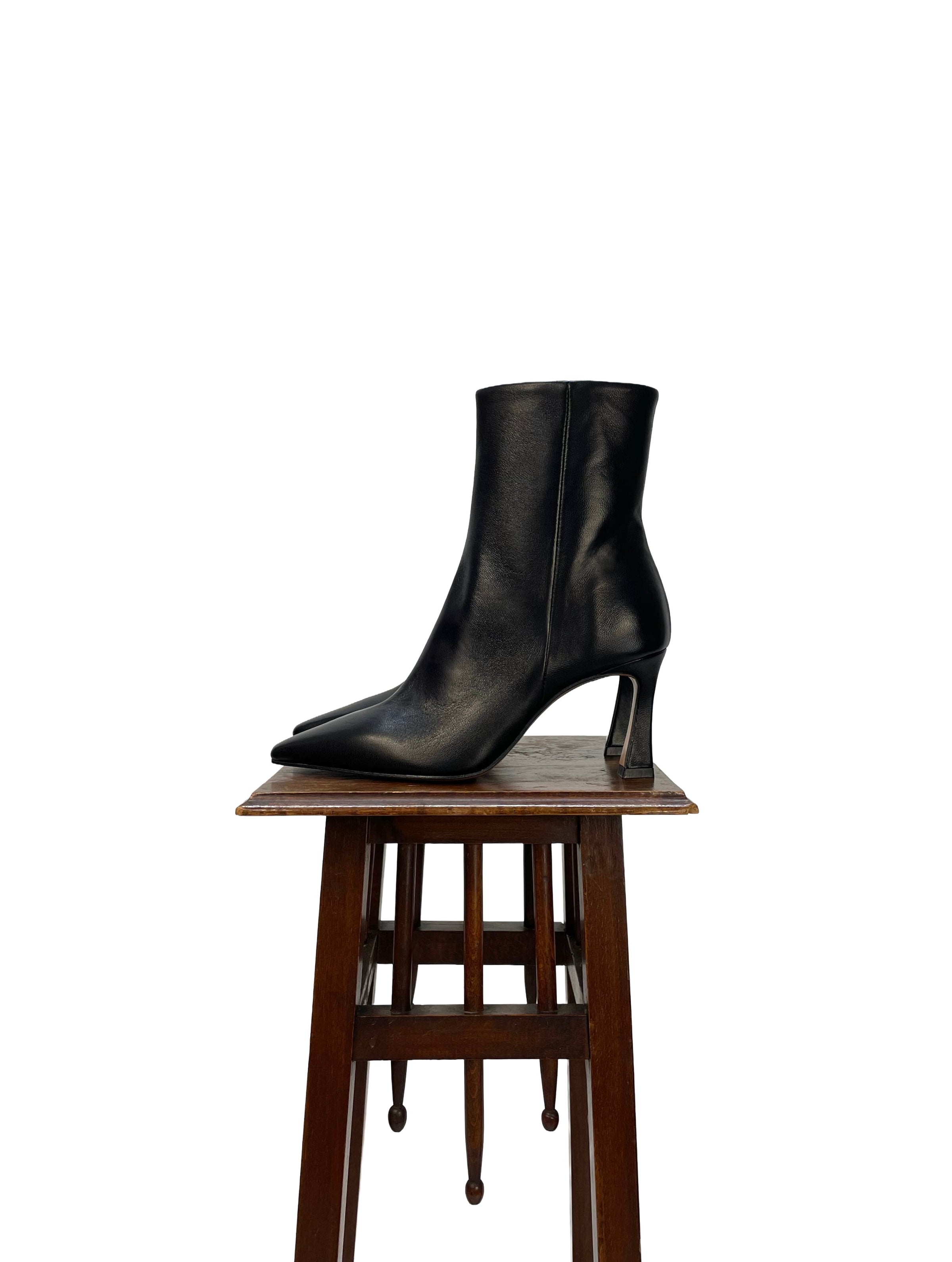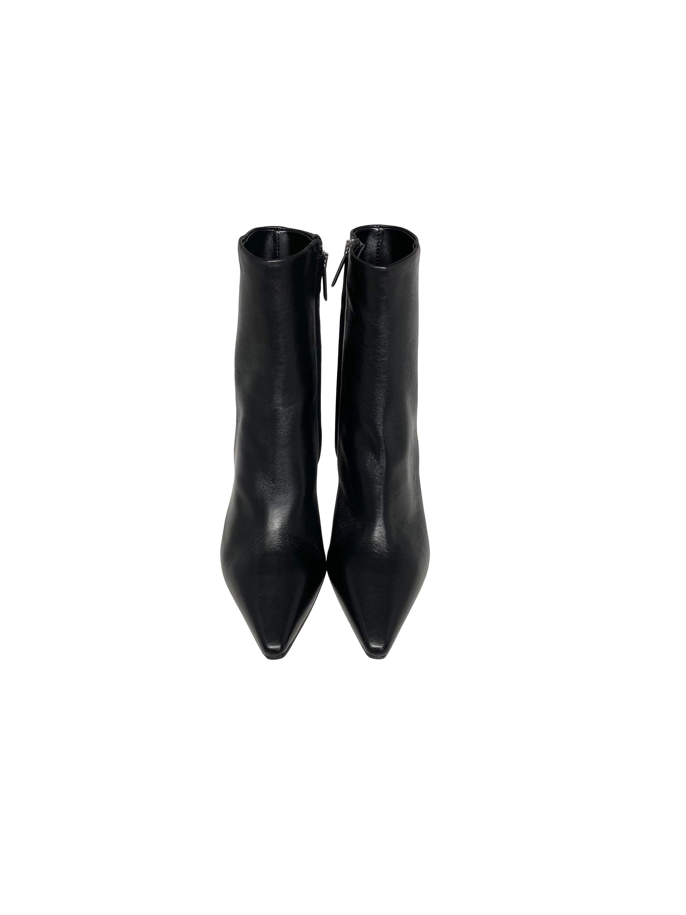Bootie con punta sfilata e tacco di 7,5 cm. Cerniera interna. Pelle nera. Calzata regolare.