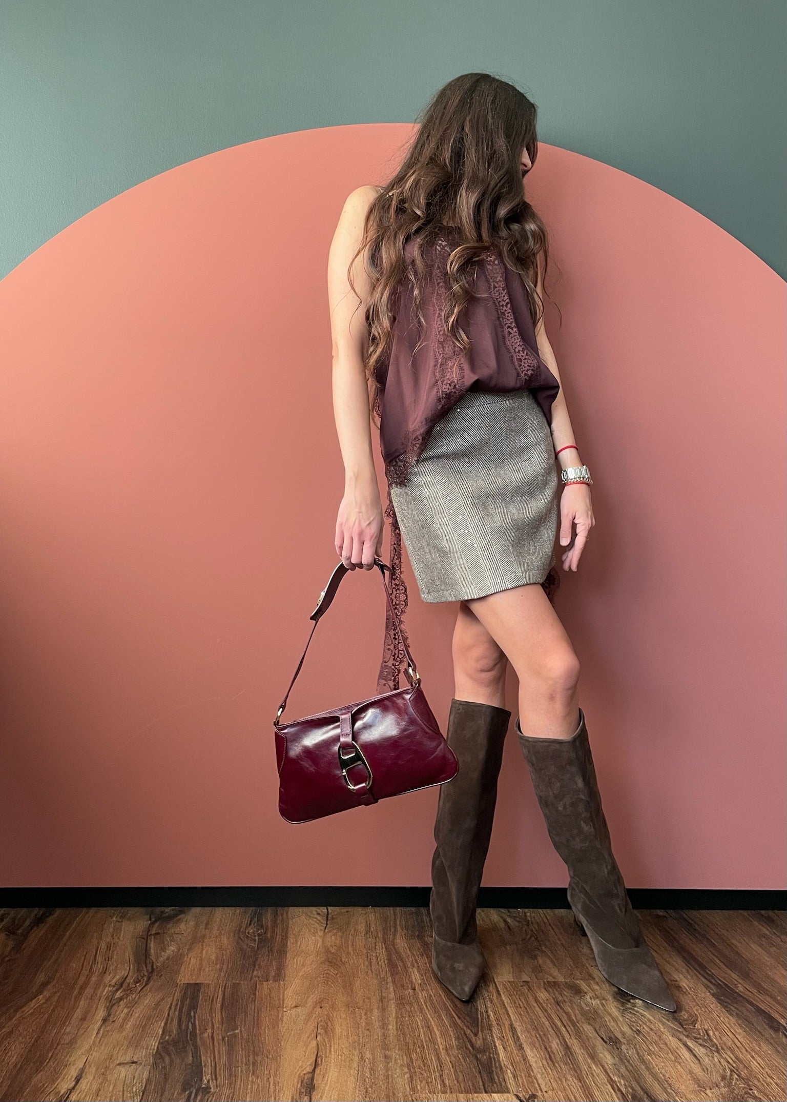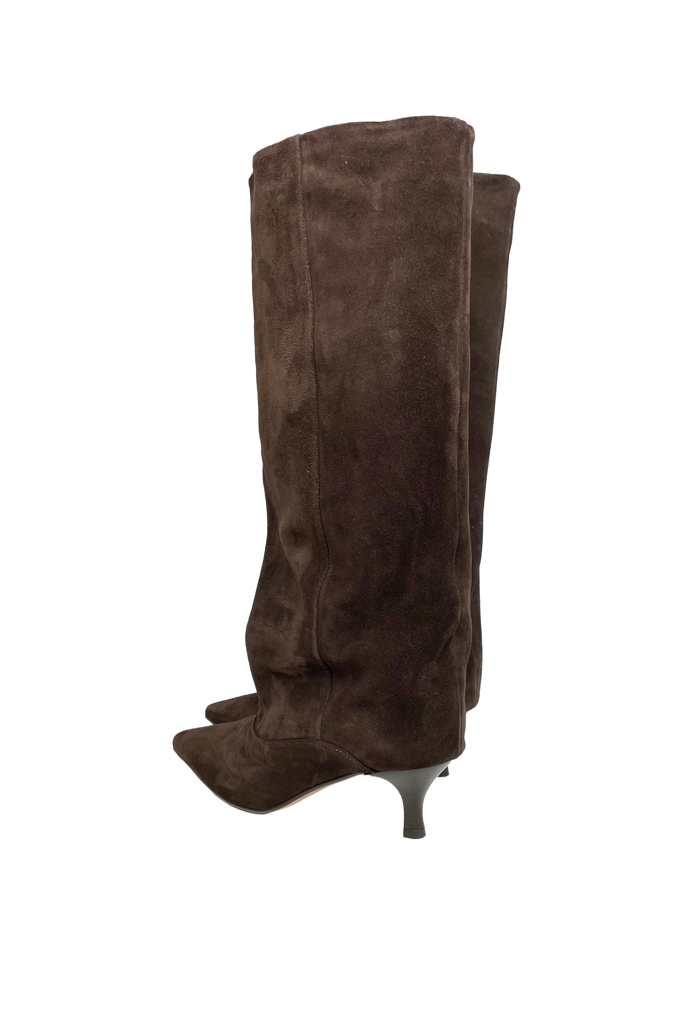 Stivale dal gambale slouchy in camoscio, tacco kitten 5 cm. Disponibile in testa di moro e in taupe. Calzata regolare.