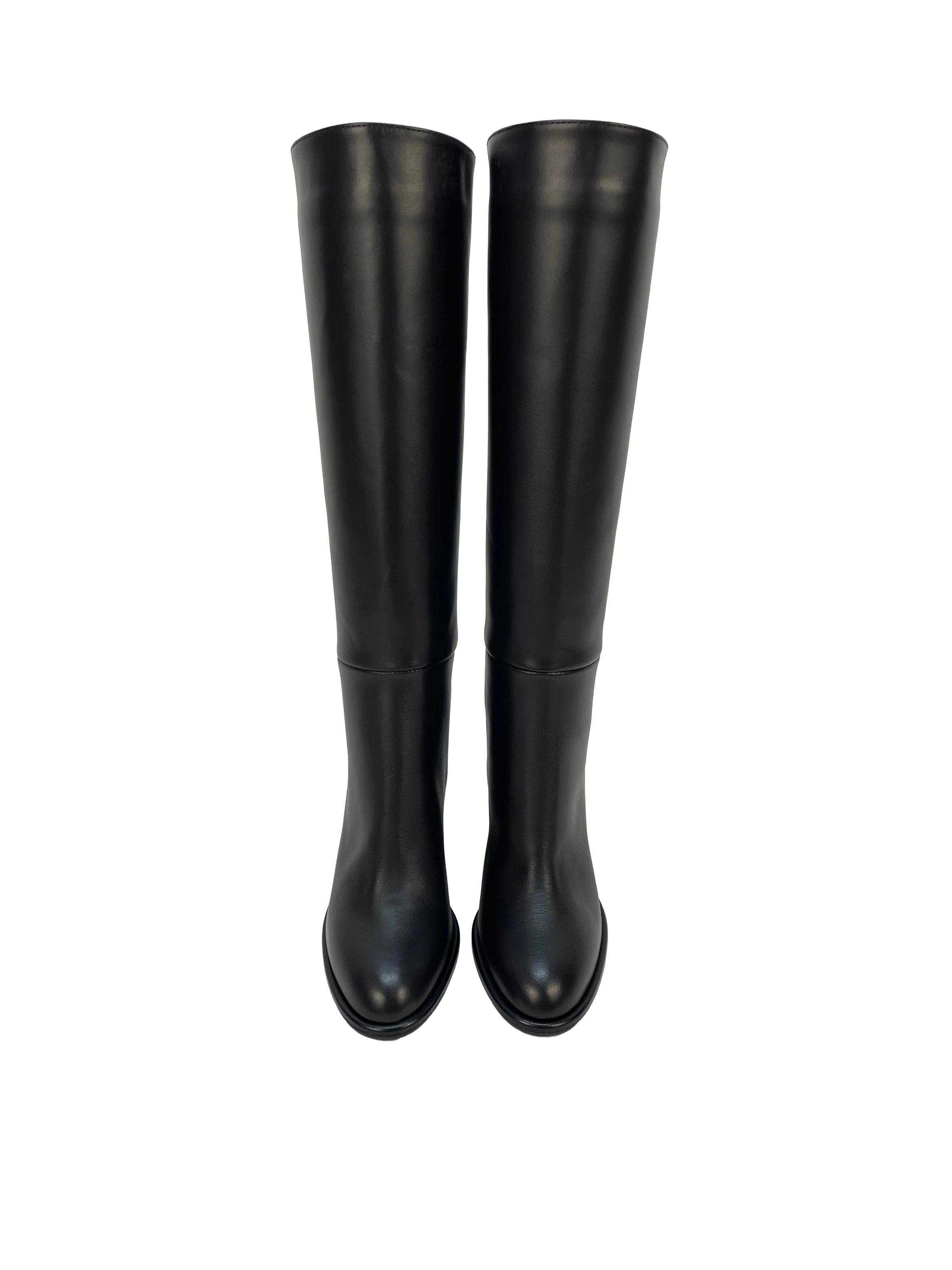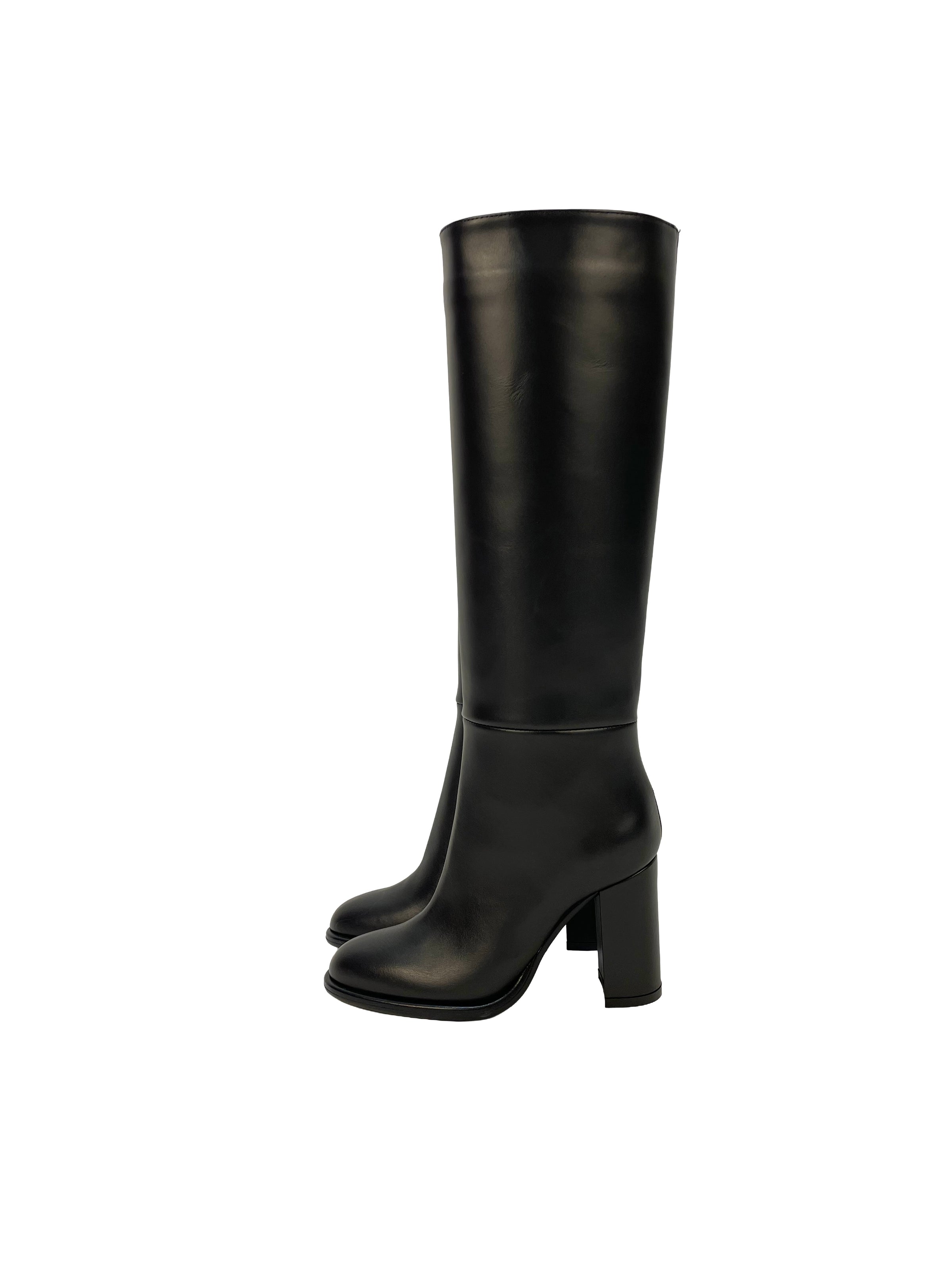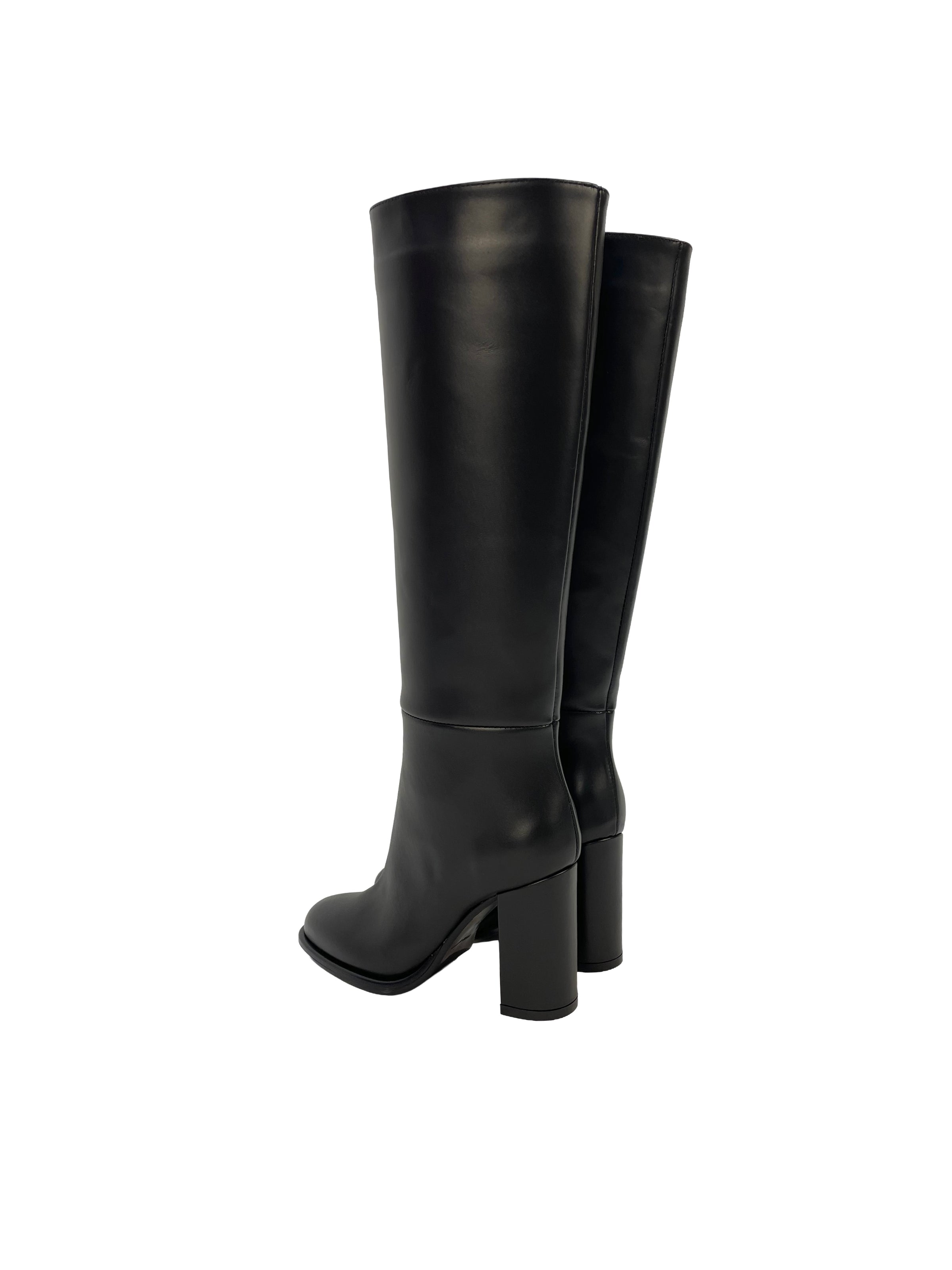 Stivale con la punta arrotondata e tacco ampio, di altezza 9 cm. Calzata regolare. Nappa nera. Made in Italy