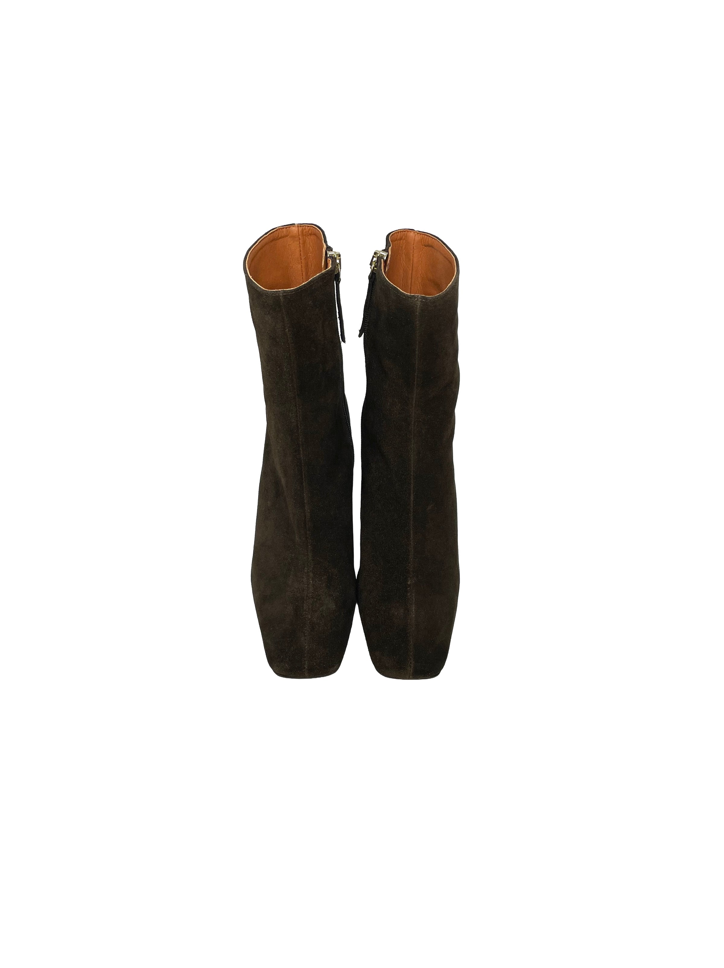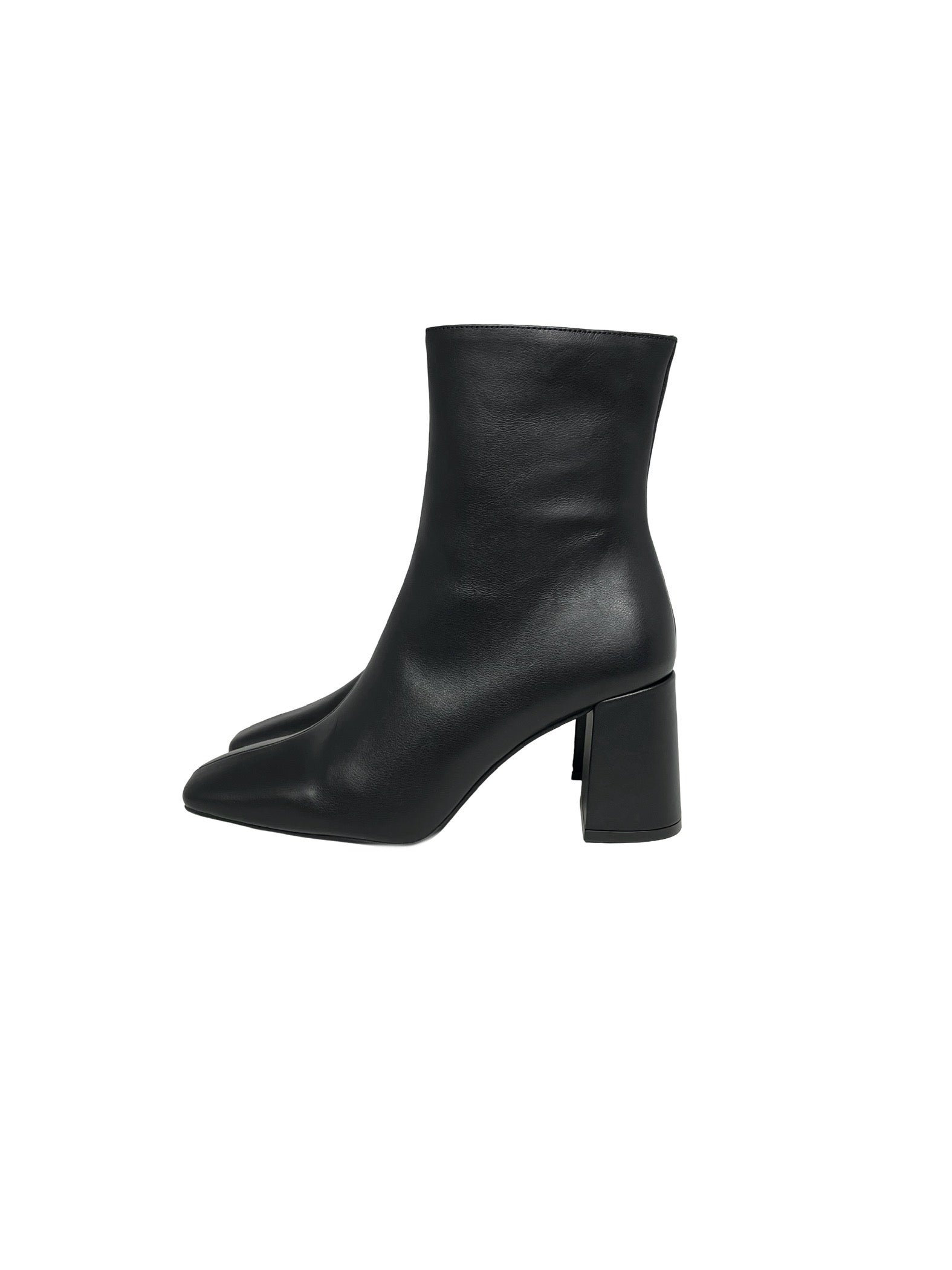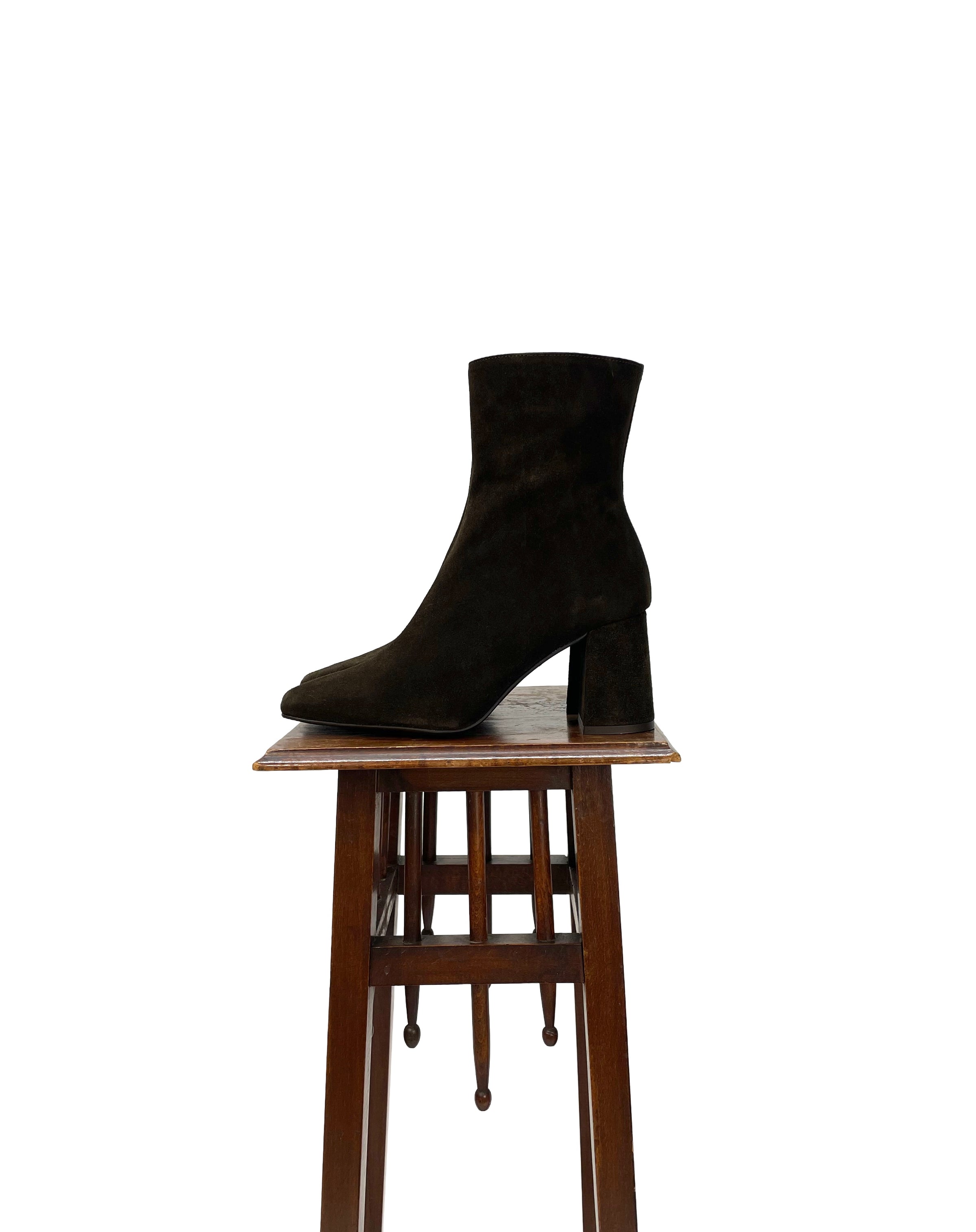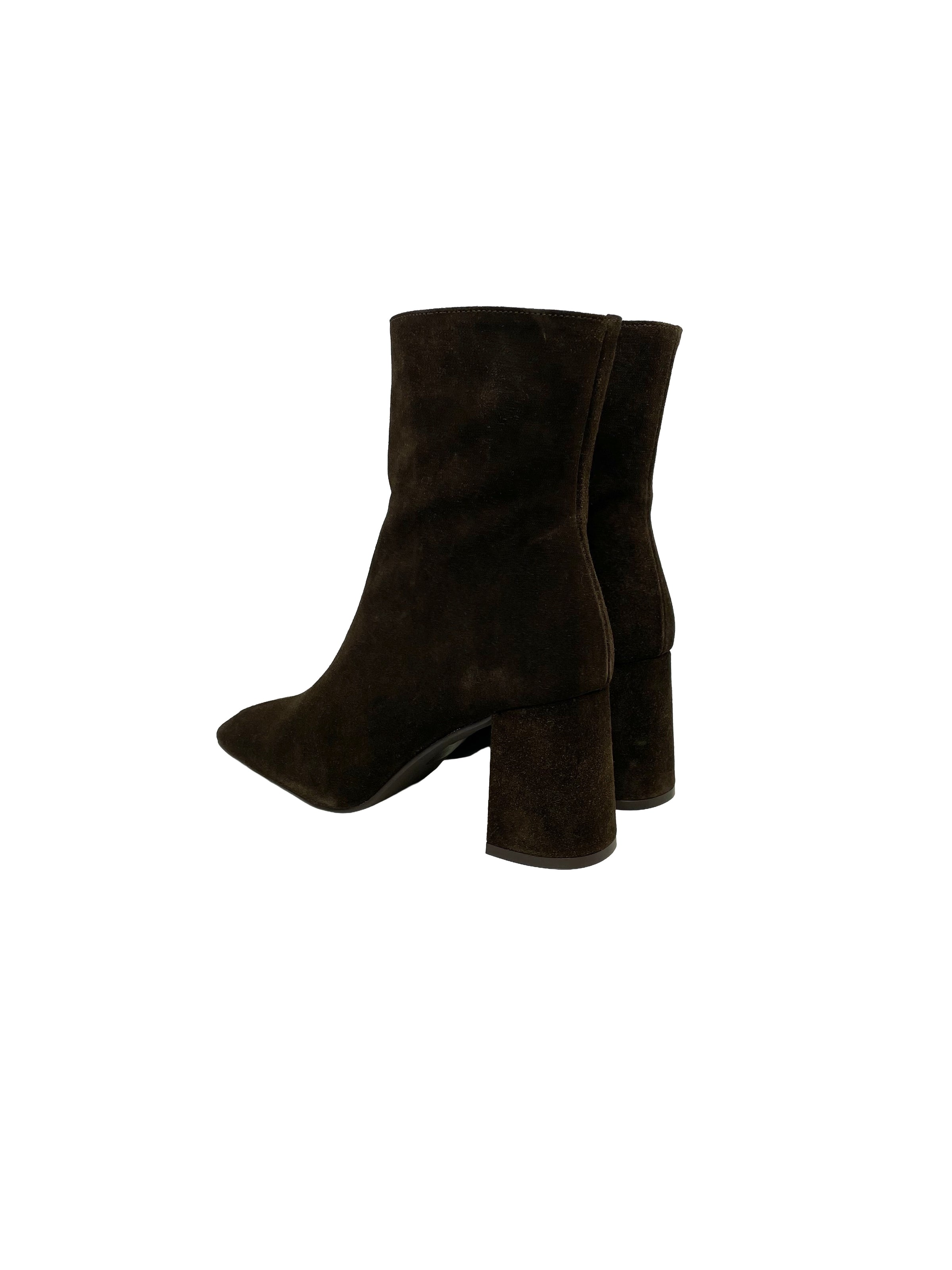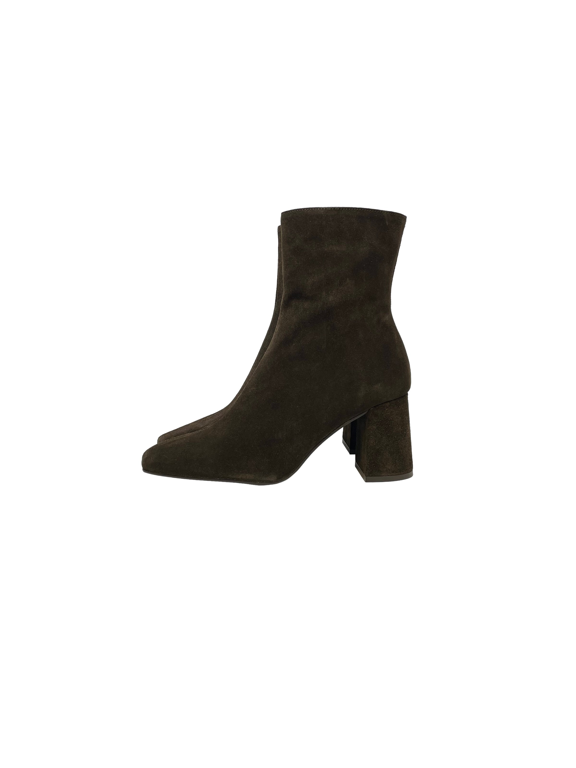 Bootie tacco medio di 5 cm, disponibile in pelle nera e in camoscio moro. Cerniera interna. Calzata regolare